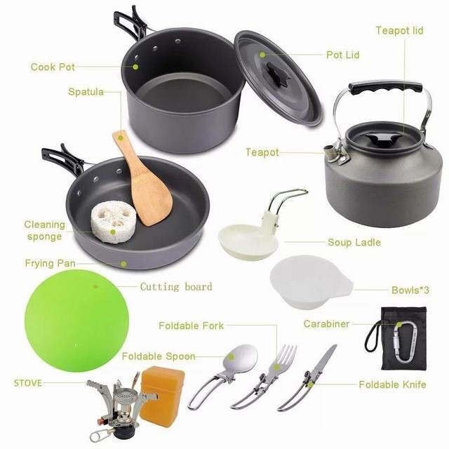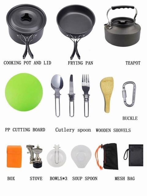 【仕様】材質:アルミニウム合金 重量:1050g 使用人数:2~3人(推薦) 鍋:17cm x 9cm フライパン:18cm x 4.5cm やかん:15cm x 8cm 付属品:PP材お碗お碗x3 竹しゃもじx1 スポンジx1 ナイフ×1 フォーク×1 スプーン×1 PPカッティングボード×1 バーナー×1 Dリング×1 収納袋 ×1