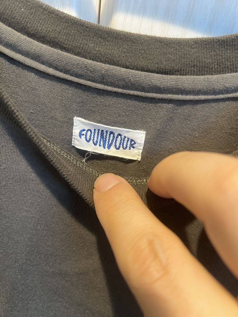 1980年代に見られたTC素材のポケットTシャツ。ボディがポリエステル混だから、コットン100%でつくられる首のリブ部分には似寄りの色の生地を使用していて、よく見るとちょっとだけトーンが違うのがユニークでした。当時はまだインナーとしての地位しか確立しておらず、どの個体もサイズが小さいのがネックでしたが、〈FOUNDOUR〉ではそれをボックスシルエットにアレンジしなおし、現代でも着られる1枚へと蘇らせています。