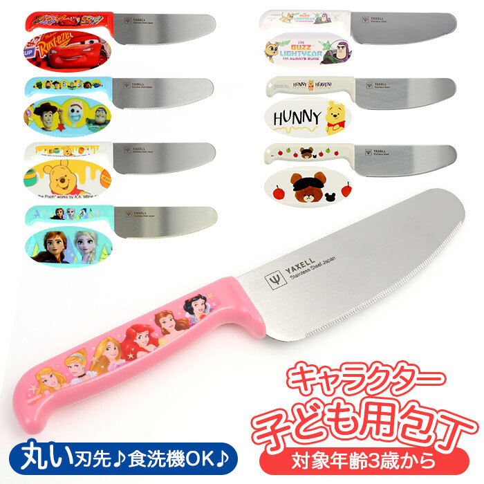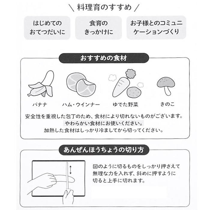 注意点 | [対象年齢]3歳から(年齢は目安です。お子様の成長に合わせてご購入ください) ※安全性を重視した包丁のため、食材により切れないものがございます。 ※やわらかい食材にお使いください。 ※加熱した食材はしっかり冷ましてから切ってください。 ※小さなお子様だけでのご使用はやめてください。ご使用時には大人の方が一緒になってお子様に道具の使い方を教え、十分ご注意の上安全にご使用ください。 ※箱から取り出すときは、必ず保護者の方が柄を持って取り出してください。指を切る恐れがあります。 ※ご使用前に食器用洗剤などでよく洗浄してからご使用ください。また、タワシや磨き粉で洗浄すると傷がつく恐れがあります。ご注意ください。 ※アルカリ性洗剤又はオレンジオイル洗剤は絵柄が剥離することがありますので使用しないでください。 ※柄部は樹脂です。火に近づけると変形したり溶ける恐れがあります。ご注意ください。 ※冷凍食品は、解凍後にご使用ください。 ※ご使用後はよく洗浄し、乾いた布で拭き取ってください。 ※収納する時は必ず柄を持って収納してください。 ※乳幼児の手の届かない所に保管してください。 ※カメラやモニターの性質により、画像と実物の色の違いがある場合がございますのでご理解願います。 |
