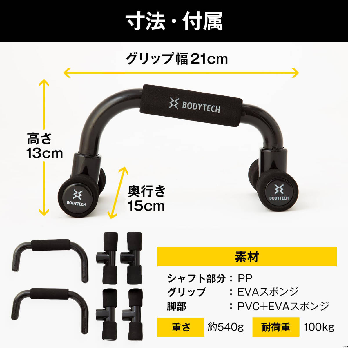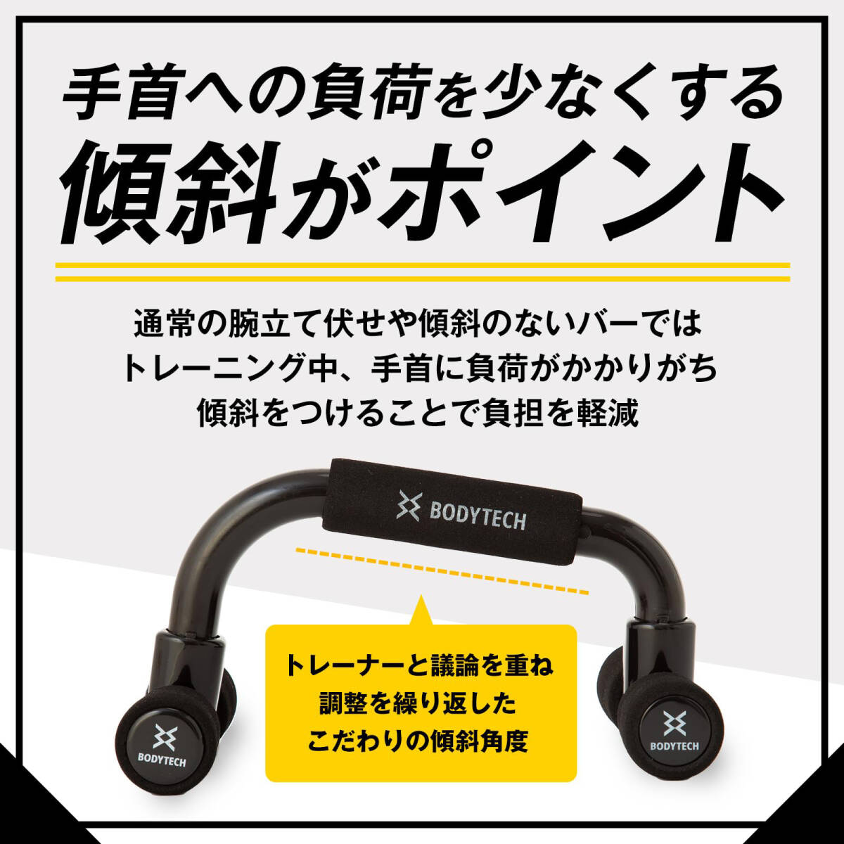傾斜付きのグリップが手首への負担を軽減し、正しいフォームを保ちながら胸・腕・肩を効果的に鍛えることができます。