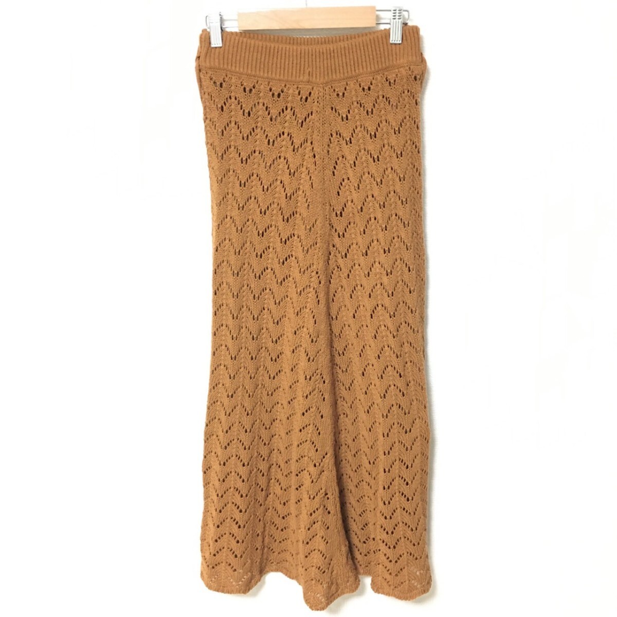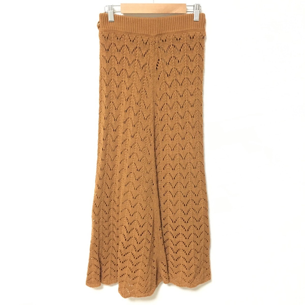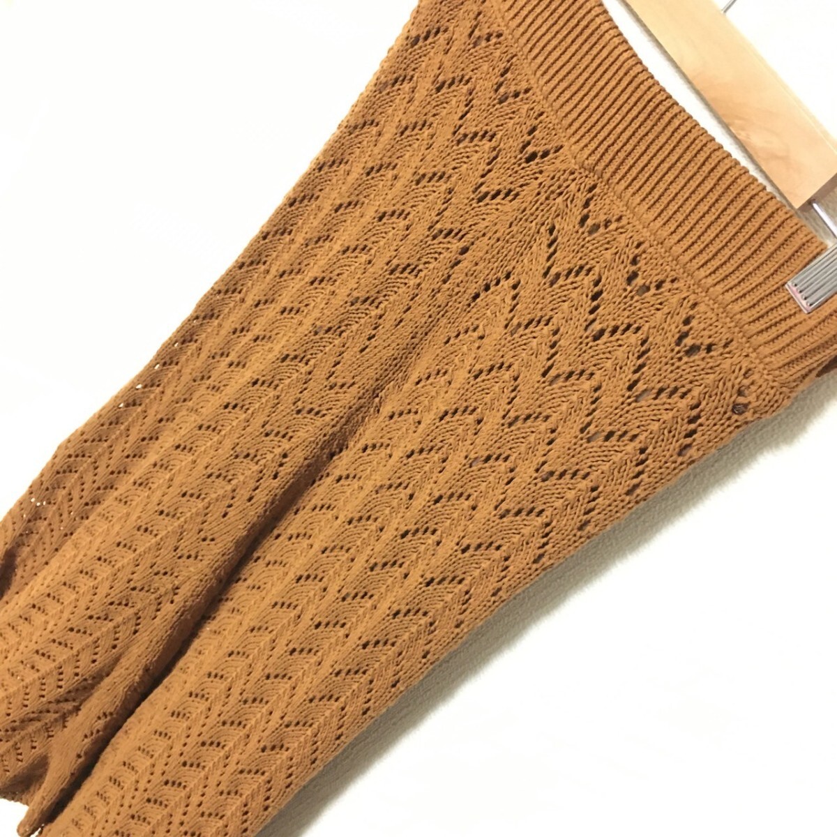 W147【Mila Owen】ミラオーウェン ニット ロング スカート 膝下丈 フレア レース シースルー ブラウン レディース サイズ 0 (S位)/fa