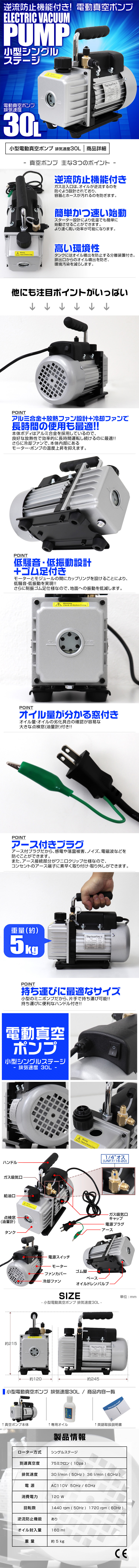 電動 真空ポンプ 30L 逆流防止付 小型強力真空引き 自動車 ルームエアコン修理用 シングルステージ エアコン カーエアコン メンテに