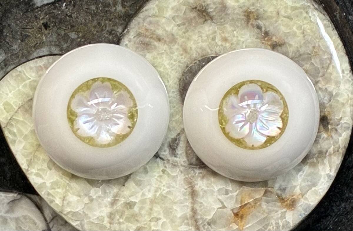 ダイヤモンド原石、ペリドット、マザーオブパールを使用した16㎜のアイです。