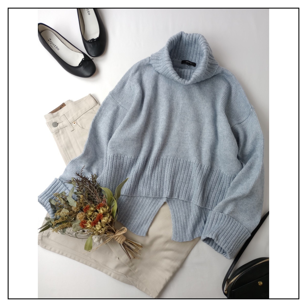 【特徴】オフタートルデザインとオーバーサイズシルエットが魅力のニットです。首元にボリュームを持たせたデザインは顔周りを華やかに見せ、小顔効果も期待できます。身幅や袖まわりはゆったりとしたワイドシルエットで、着丈はすっきりとしているためさまざまなボトムと好相性。流れるようなラインと後ろのバックスリットが後ろ姿を美しく演出します。袖口を折り返したディテールがこなれ感をプラス。ウール混の適度な厚みとハリのある素材で、立体的なシルエットが際立ちます。