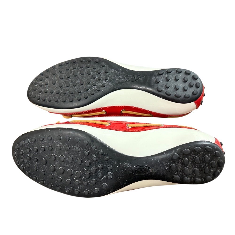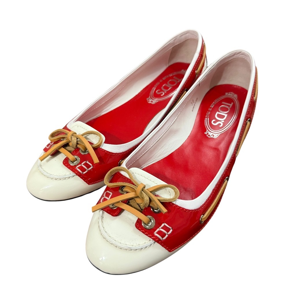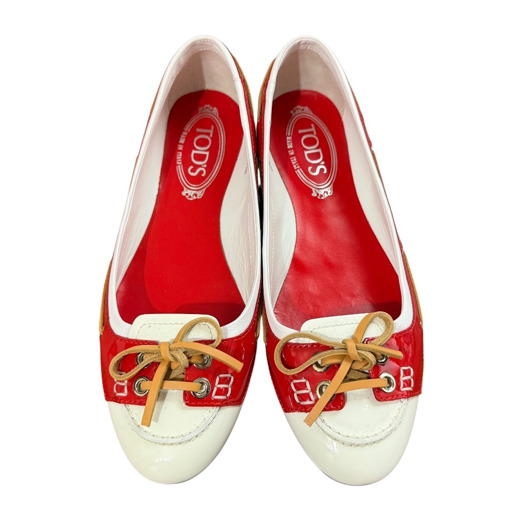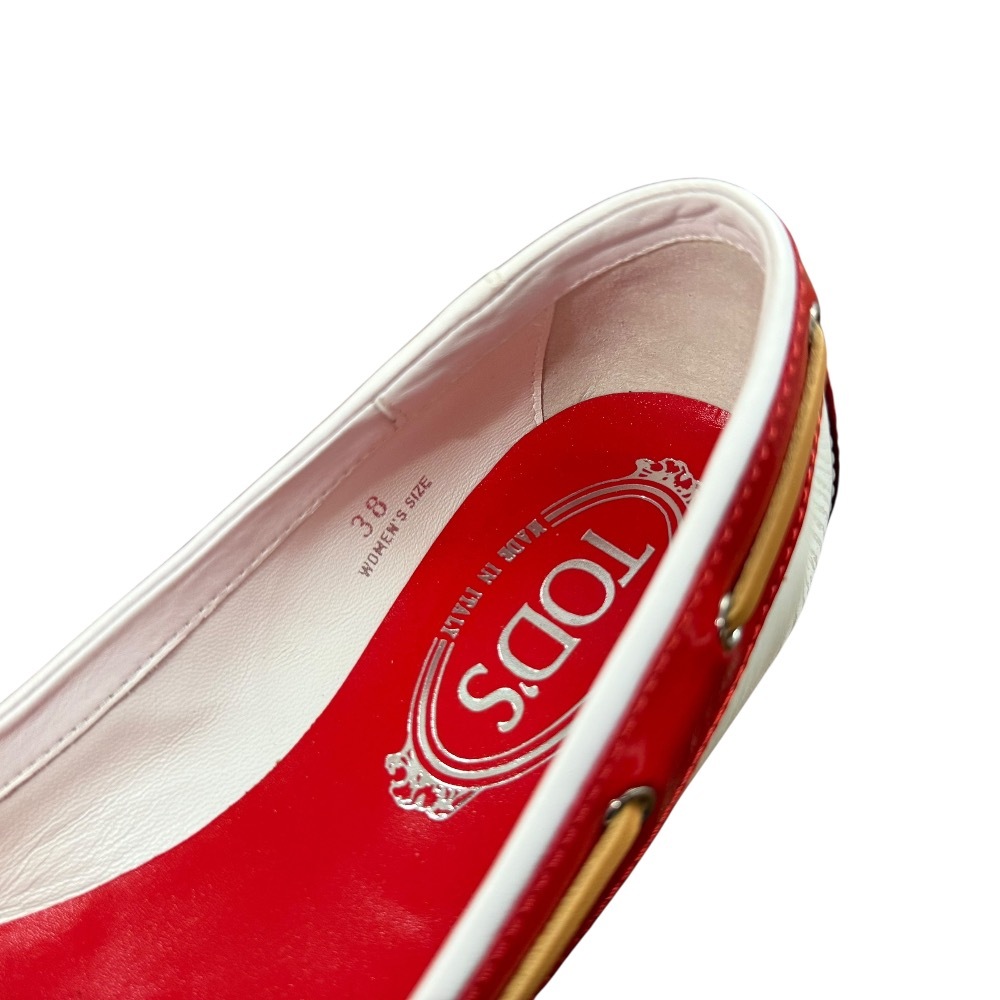 美品 TOD'S トッズ パテントレザー リボン ドライビングシューズ サイズ38 約25cm ホワイト×レッド