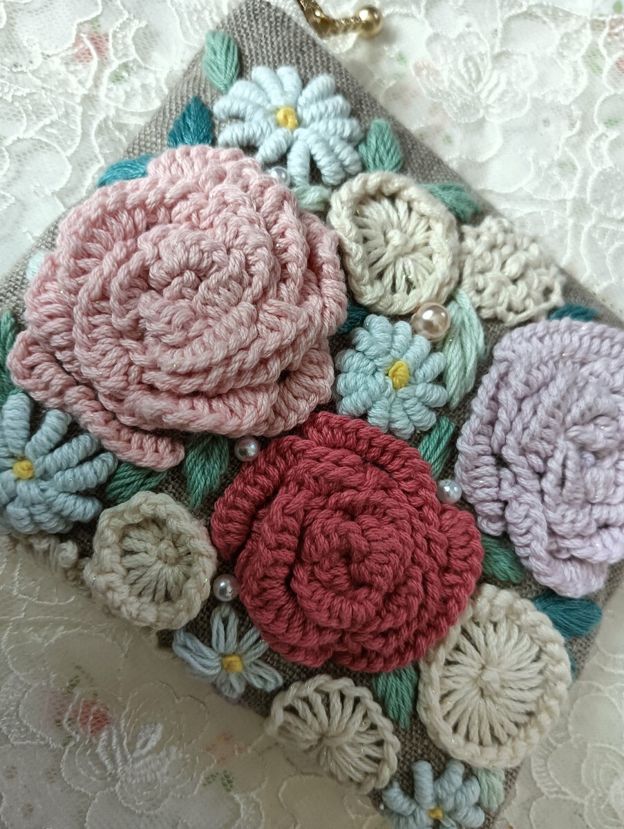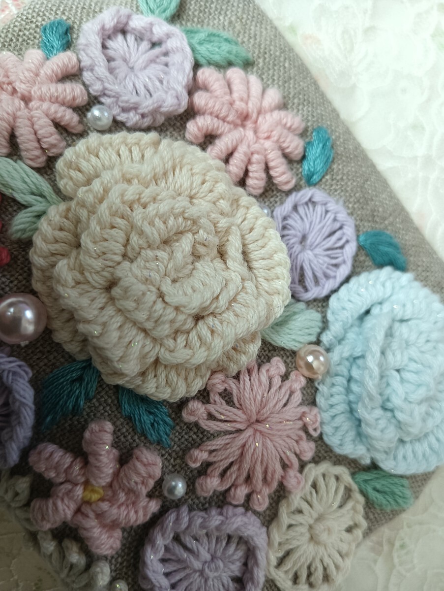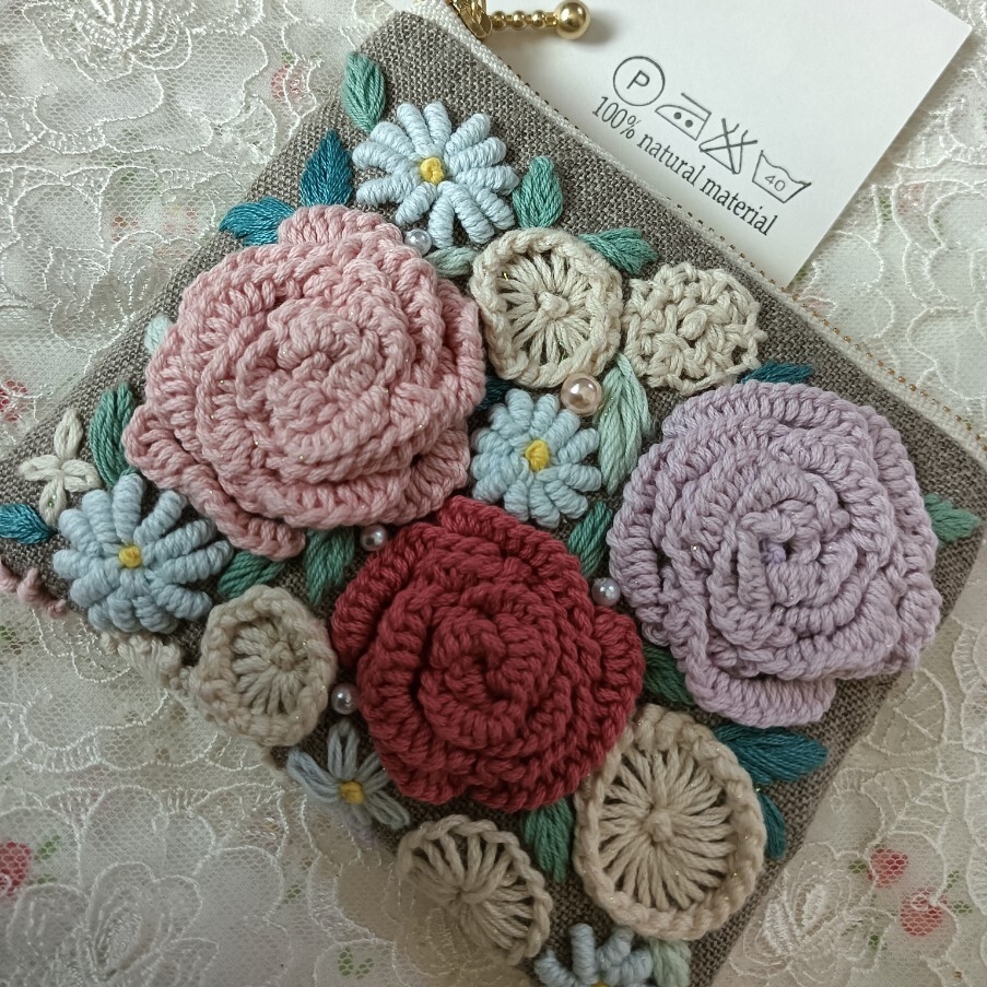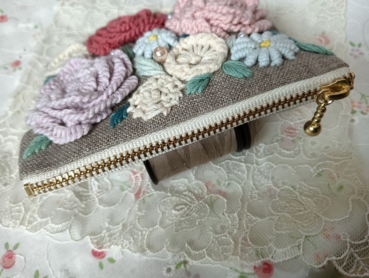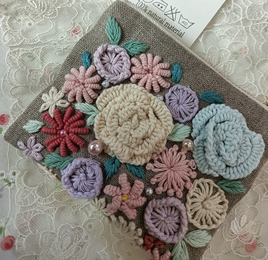 handmade★手刺繍★リネン★ポーチ★花いっぱい両面刺繍