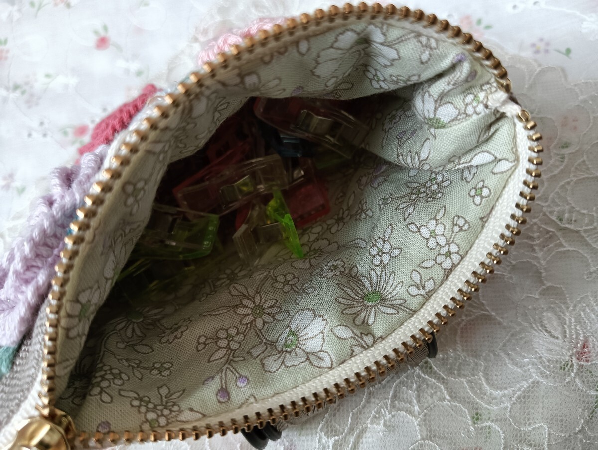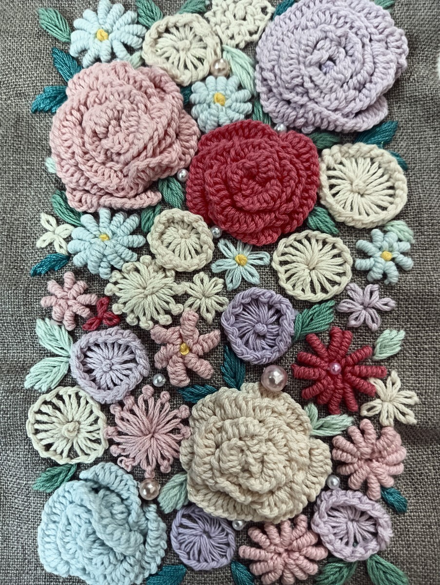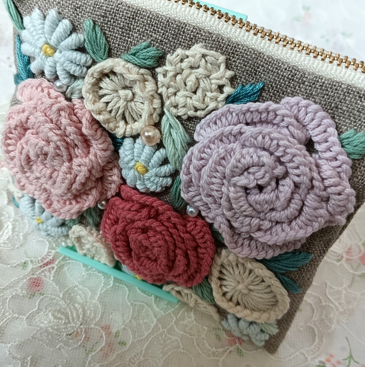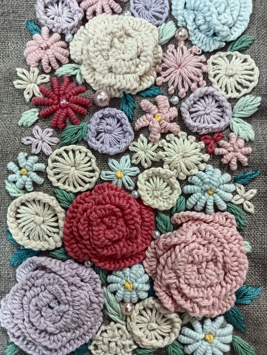 handmade★手刺繍★リネン★ポーチ★花いっぱい両面刺繍