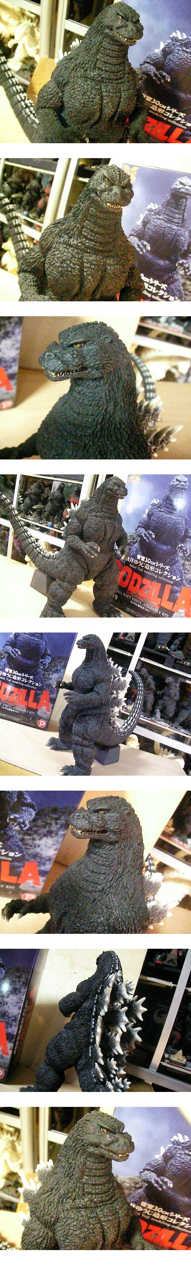 酒井ゆうじ氏原型 ソフビ 高さ31cm 鼻先から尻尾まで約45cm 元箱・インスト・台座付き。30cmサイズで決定版と言える名作ゴジラを連発している酒井さんの、これもまたバトゴジの最高峰のひとつに挙げられるような素晴らしい造形のキットです。劇中の丹沢のゴジラをそのまま切り取ったようなカタチが見事に再現されています。ソフビ製品としては近年、抜きの技術が格段と上がっていて皮膚の凹凸も深い。ただし、ここで何度も言及しています事象としてソフビ版は芯がなくガワだけなのでどうしても折り目の谷側に引っ張られて、ややほっそりとしてしまうのが(完成品版含め)数少ない弱点になっています。カタチそのものは非常に優れたゴジラですので、そのままでは勿体ないと思います。そこで今回もゴジラの体の殆どに新聞紙を細かく千切って中にパンパンに詰め込んで程よい張り出しを加えてみました。結果、首の付け根から体にかけて幅が太くなりレジン版に負けないゴツい、それでいてシュっとした体型になっています。また、背ビレは左右の大きな列6枚を少し外向きに角度を変えましたのでハスに見ても背ビレが好い具合に見えると思います。塗装ではバトゴジは新規スーツなので、それに倣って全体はキレイ目に塗装しました。最後に顔周り。口内は少し濁ったピンクに、牙は爪よりも黄に近い乳白色です。目の部分は赤黒いアイラインに若干の白目。瞳は黒い枠に内に向かって赤に近いオレンジ→黄→黒い瞳孔で左右の視線は前方にきちっと合わせてニラミの利いた顔にさせてあります。以上、既製完成版よりも良い物に仕上がったと自負していますので気に入って頂けます方、このご機会をお見逃しなく!よろしくお願いします。