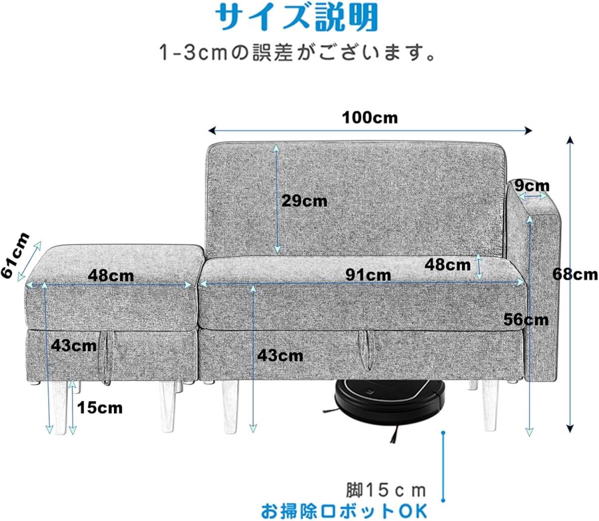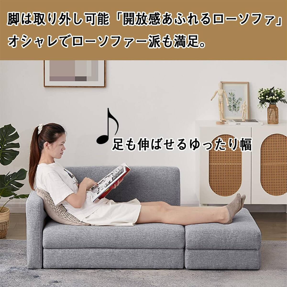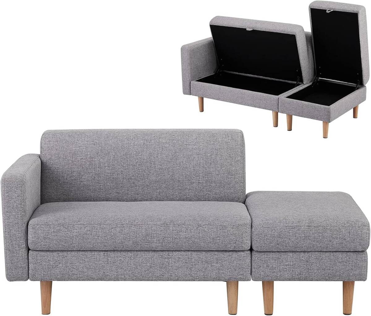 ソファ 2人掛け 収納付き カウチソファー オットマン付き ファブリック 肘掛け 木脚外し可能 ローソファ コンパクト (ライトグレー)