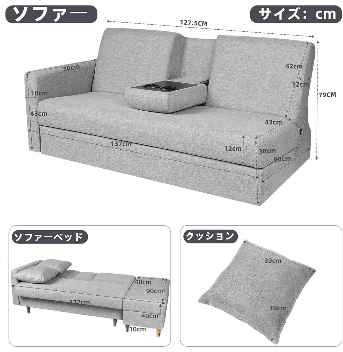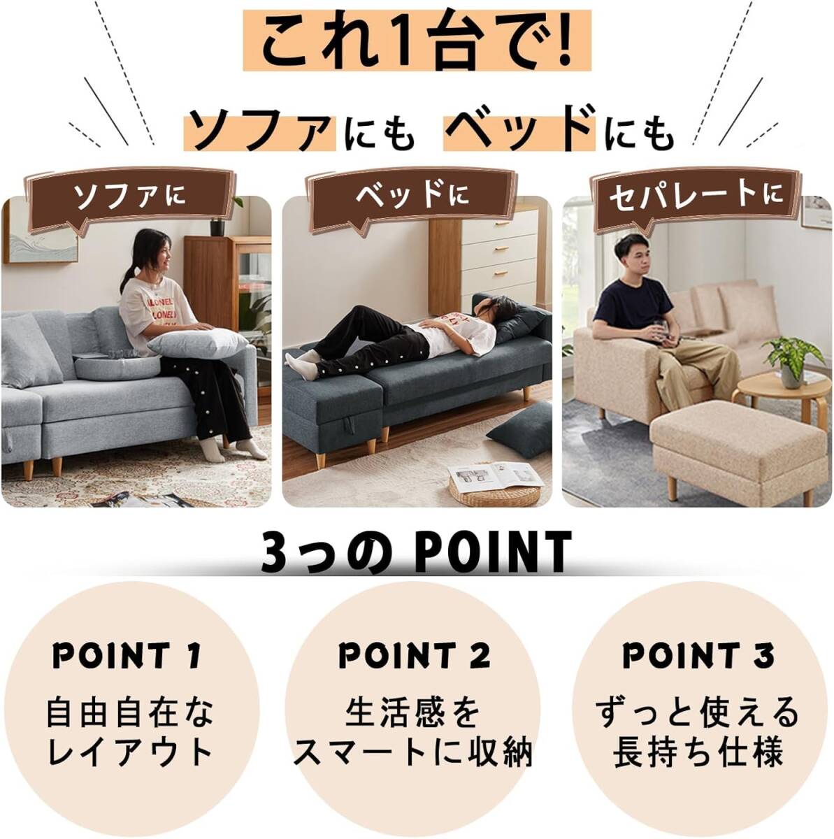 • 1台2役、多機能のソファーベッド!ソファーはローリング式の設計ですので、ソファー座面を持ち上げ、「カチャ」の音がするまでに座面を下に押さえながら下げます。ソファーからソファーベッドに変身します。オットマンと合わせて180㎝長さのベッドになり、ゆったりとくつろげます。