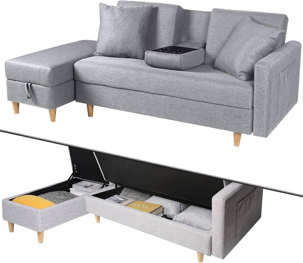ソファー3人掛け ソファベッド 大容量 収納付き カウチソファー お洒落 多機能リクライニング ソファ 一人暮らし (ライトグレー)