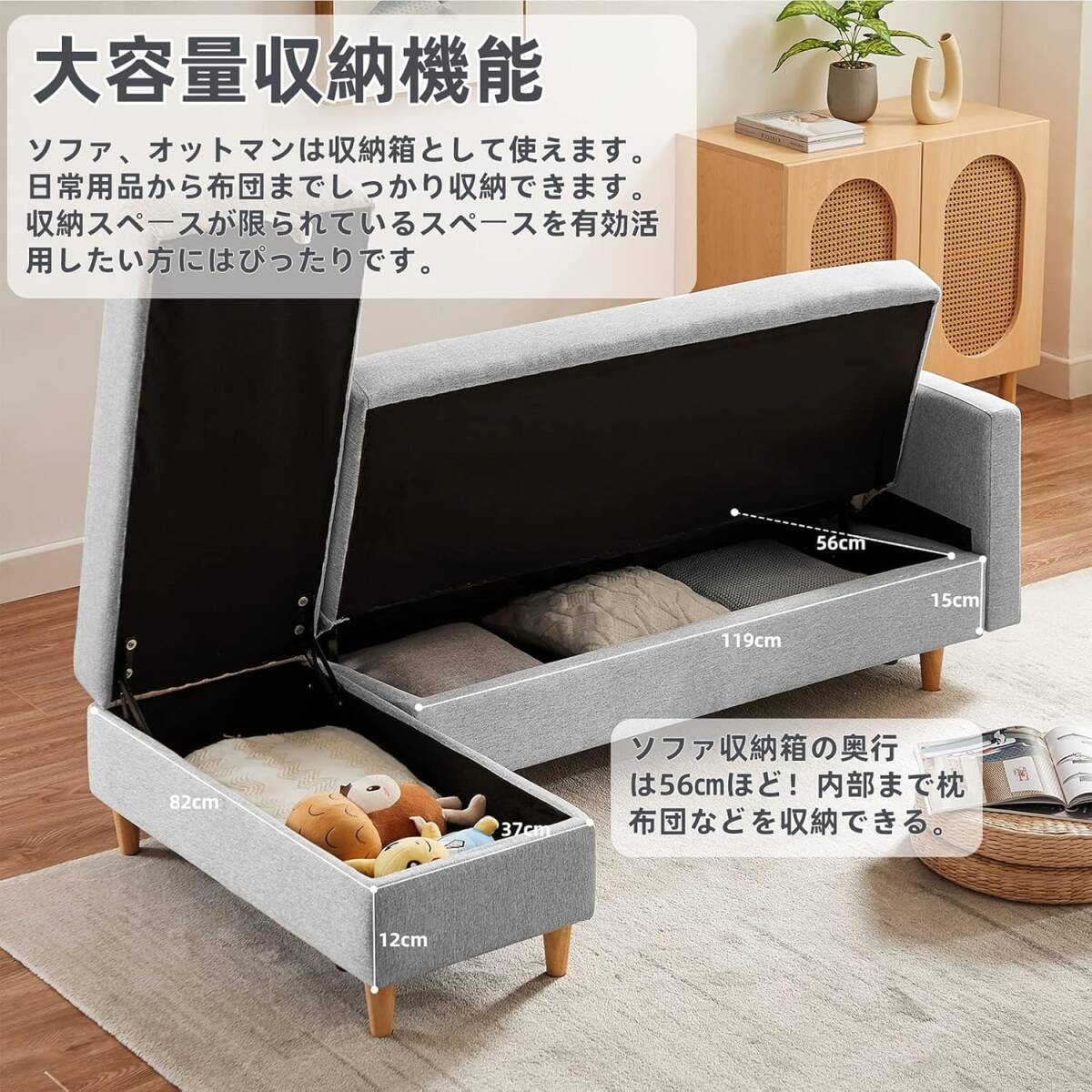 • たくさん収納収納スペース付きソファー,オットマンとも収納スペースついています。布団、オモチャなどの生活用品を簡単に収納できます。肘掛けにも収納袋付き、雑誌、スマホやリモコンなどの小物を収できます。ワンルームのような狭い部屋の収納空間は大幅に上昇します。