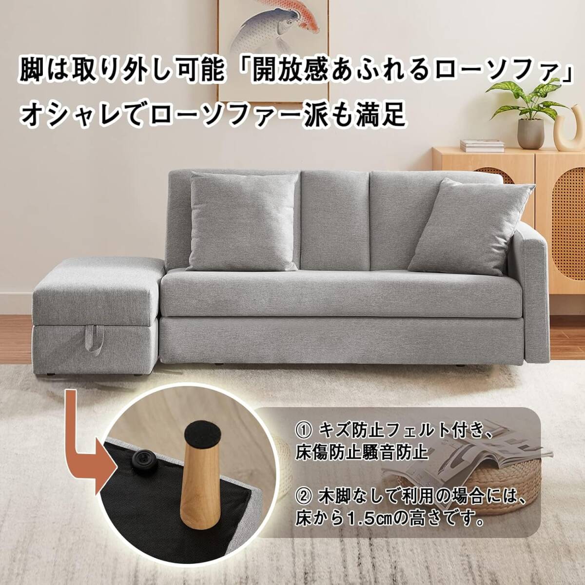 • ブナ無垢材の10cm木脚付き、脚なしで利用可能。木脚の長さは10㎝なのでほとんどのロボット掃除機は対応できます。ソファー座面下の掃除は楽です。木脚なしで利用の場合には、床から1.5㎝の高さです。取り外し可能なブナ材製の木脚付き、女子一人でも簡単に組み立てられます。脚なしでも利用可能なので、ご都合によりご利用いただけます。