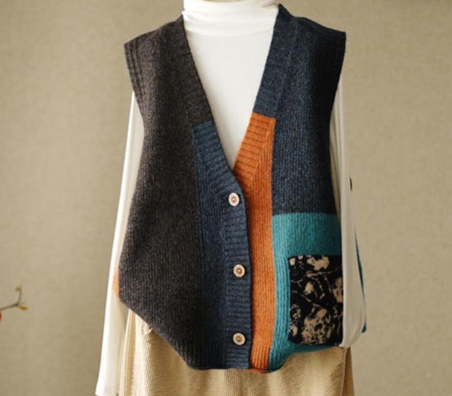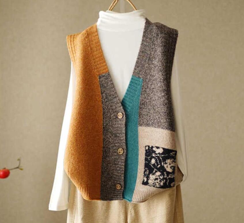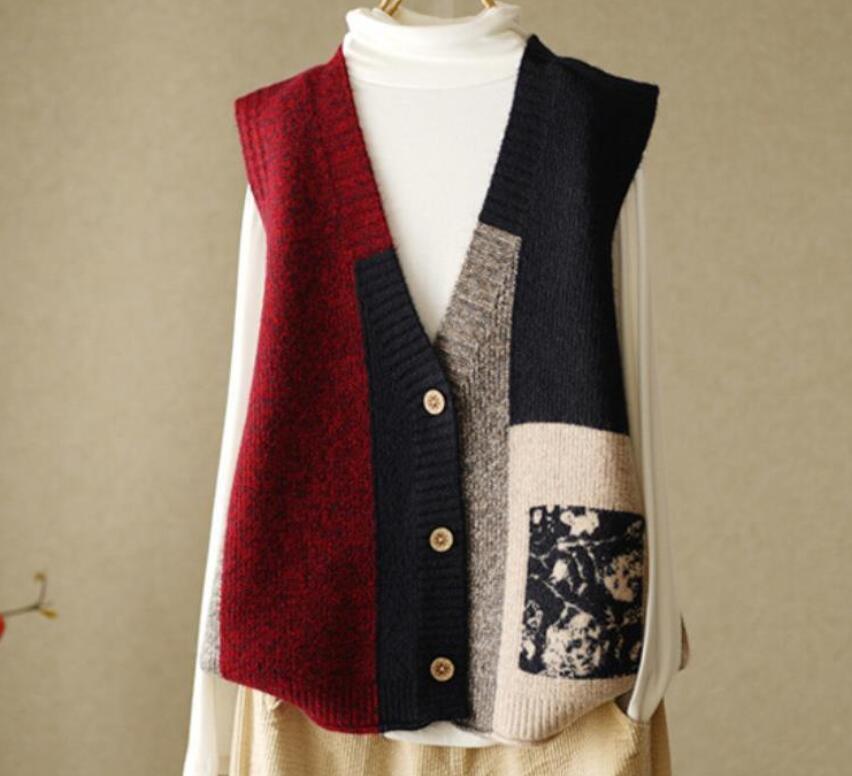 秋冬新作~オシャレ セーター ベスト 前開き 袖なし ボタン ベスト 復古 配色 チョッキ 大人 ニットベスト トップス ~ カーキ