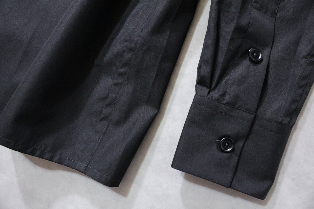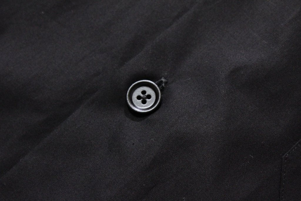 小ぶりなレギュラーカラーで、左胸にポケット、前立てなし、裾はスクエアカットです。