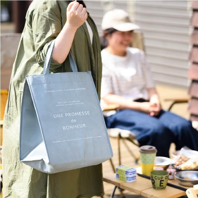 シンプルな欧文デザインが人気のボヌールシリーズの保冷バッグです。ケーキ用のサービス箱がすっぽり入る大き目のマチと、保冷剤を入れるポケットがついていて機能性もバツグン。エコバッグとしてリユースにもおすすめです。 落ち着いた色味と飽きの来ないデザインで、年齢や性別を問わずご愛用していだだけます。