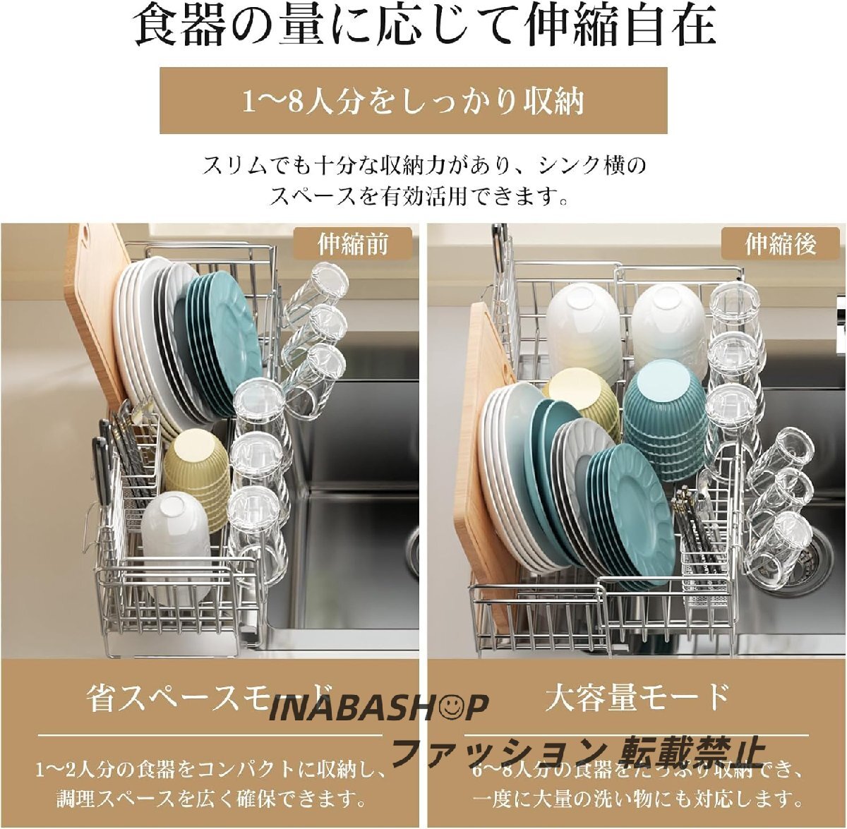 【伸縮式】洗い物の量に応じて自由に調節可能な伸縮機能で、限られたスペースを有効活用。スライドすることで、サイズを約2倍に拡大できます。