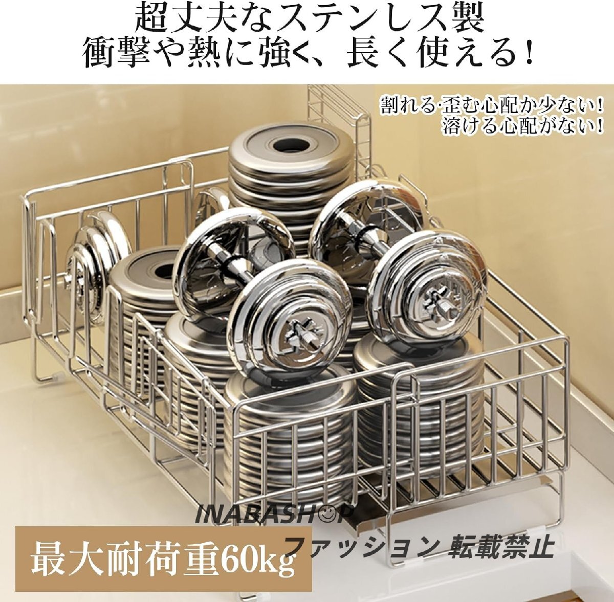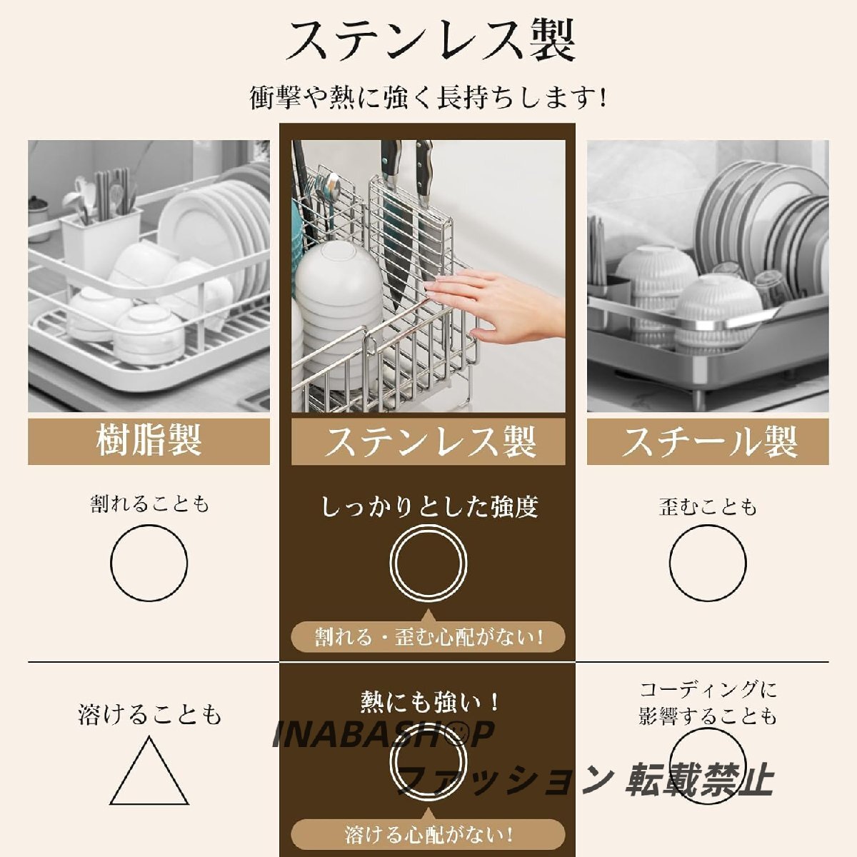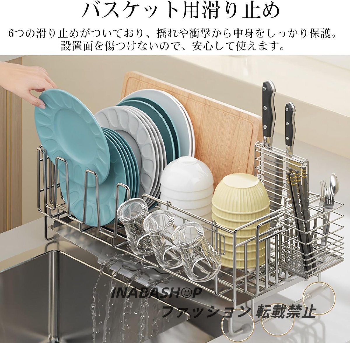 【ステンレス製】錆びに強く、強度と耐久性に優れたステンレス素材を使用。汚れが落ちやすく、お手入れが簡単な使いやすさが特徴です。本体の6箇所に滑り止め仕様が施されており、滑りにくく、キッチンへの傷つき対策にもなっています。