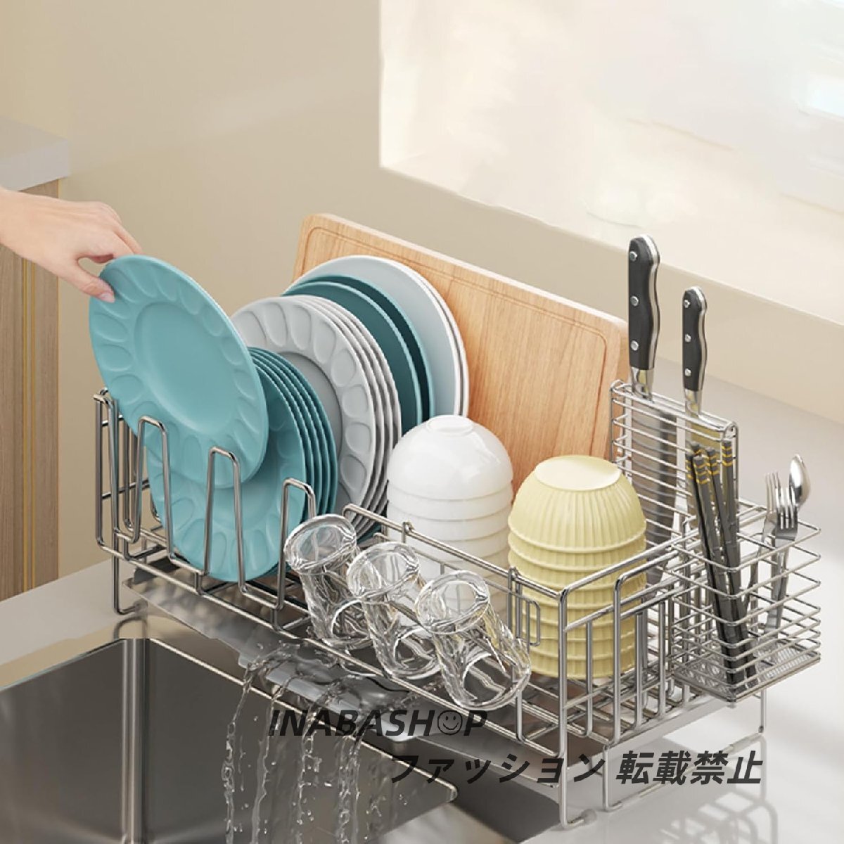 【自動排水】トレーには自動排水機能が備わっており、洗った食器からの水が自然にトレーに流れ込み、スムーズにシンクへと排水されます。手間いらずで効率よく水切りができ、キッチンを常に清潔に保ちます。