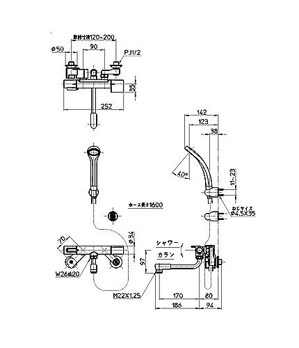 【デザイン】メッキとブラックのシンプルなデザイン。パイプの長さ:170mm ホースの長さ:1.6M 取付ピッチ:120~200mm