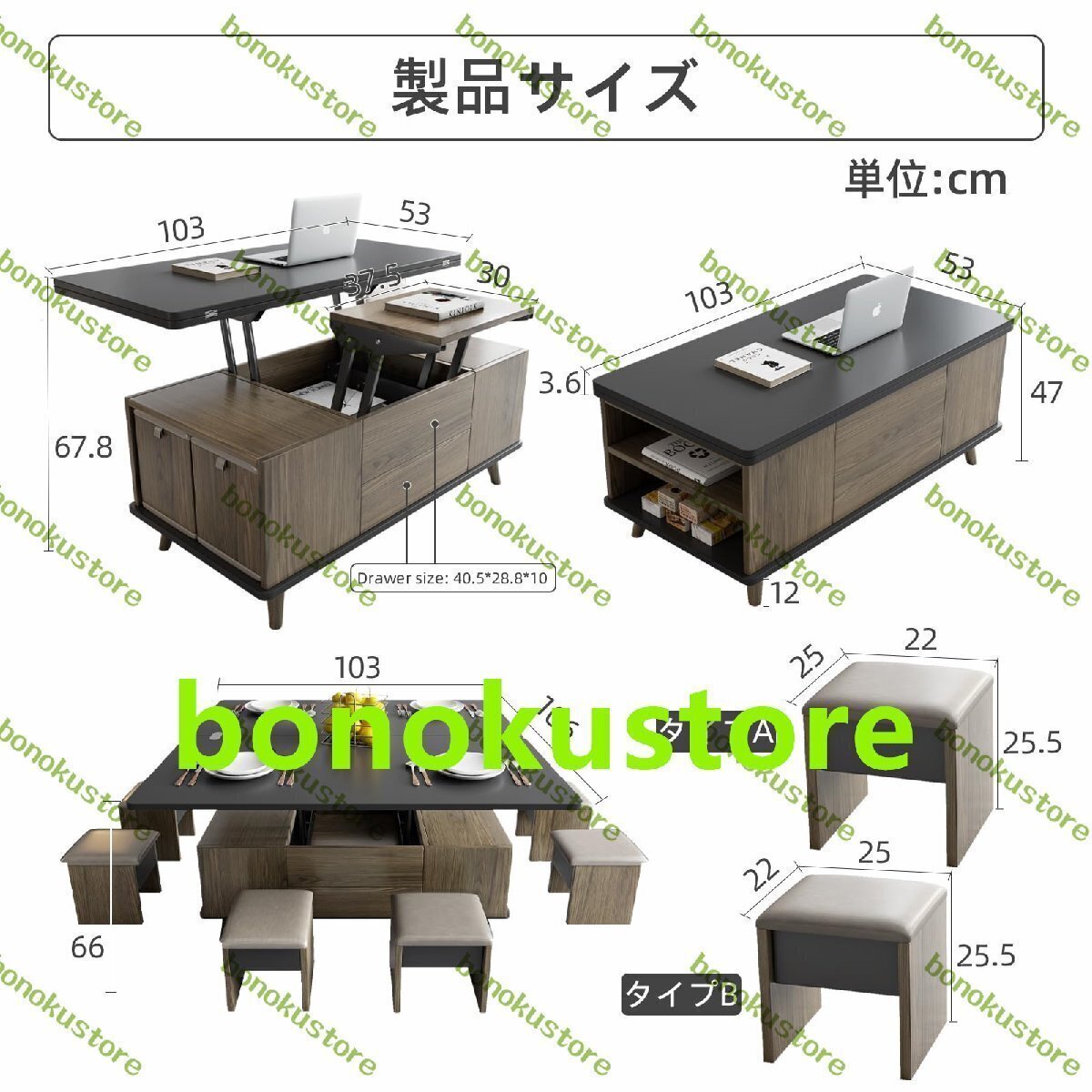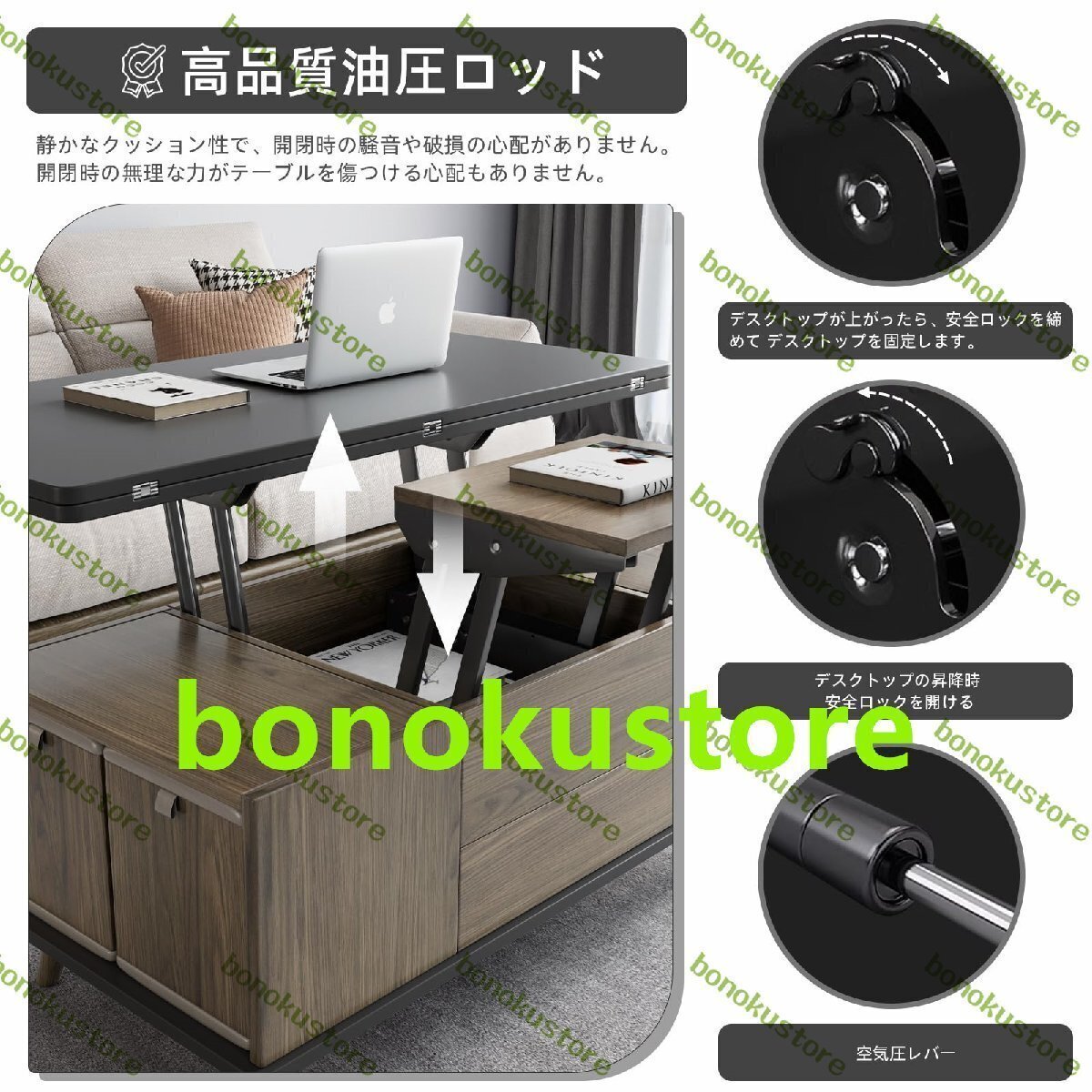 商品説明 多機能リフティングデザイン:多機能リフティングコーヒーテーブル」創造的に設計された多機能リフティングコーヒーテーブルとユニークな伸縮式折りたたみダイニングテーブルは、さまざまなスペースのニーズを満たす柔軟な使用シナリオを提供します。 収納コーヒー