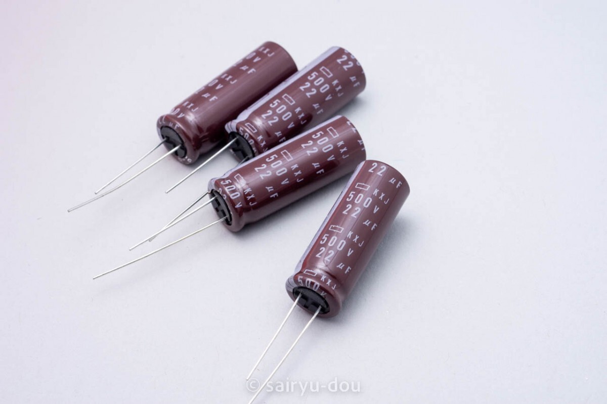 日本ケミコンのKXJシリーズ長寿命型アルミ電解コンデンサです