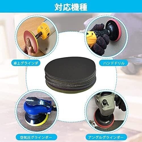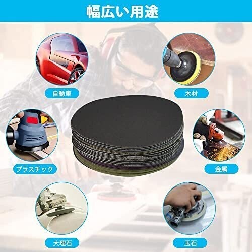 【サイズ】:12.5×12.5×0.2cm。入数 :30枚入り。カラー:ランダム。タイプ:穴なし、吸塵式用のサンディングペーパー。対応機種 :空気圧グラインダー、ディスクグラインダー。従来の研磨材と比較して、目詰まり防止、研磨はより効率的で、汚染がありません。【5種類の粒度】5種類:400#、800#、1200#、2000#、3000#。それぞれ6枚あり、合計30枚セットです。各種類のサンドペーパーの表面にはラベルが付いており、粒度を識別しやいです。研削ニーズによって耐水ペーパーの粒度を素早く変えることができます。【高品質の素材】:本製品はプレミアムのラテックス紙でできており、良好な靭性、水研ぎに強い、乾き濡れ両用のサンドペーパーです。炭化ケイ素粒子は均一に分布して、砂が落ちにくいです。良い研磨効果があり、耐久性に優れ、繰り返し利用することができます。【取り換えが簡単】:耐水ペーパーの背面は高品質なフランネル材質を採用しており、粘着性が優れていて、取り外しと交換が簡単になります。また、ドリルにしっかりと取り付けることができます。使用中に緩むことはありません。操作がとても便利です。【幅広い用途】:#400は荒研ぎ、#800-1200は仕上げ研ぎ、#2000-3000は研磨。用途によって使い分けます。金属、非金属製品、塗装面研削、木材、プラスチック、自動車製造、自動車修理、大理石、磁器、玉石および手工芸品研削など幅広く使用されています。