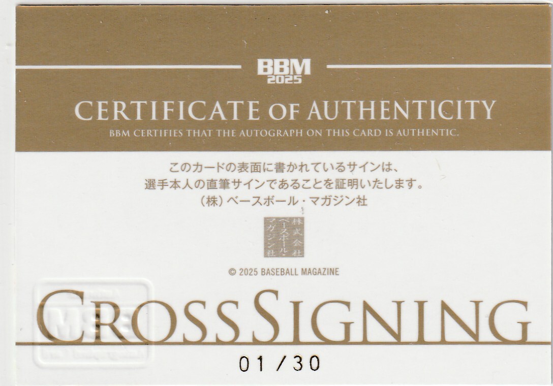 パックから出る直筆サインカードでシリアルナンバーが入っています。シリアルナンバーは01/30のファーストナンバーです。画像にはスキャナーの埃や縦線が写っている場合がありますが現物は美品です。
