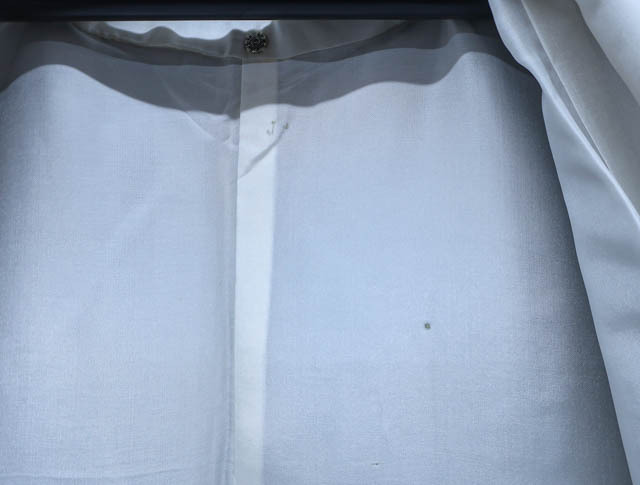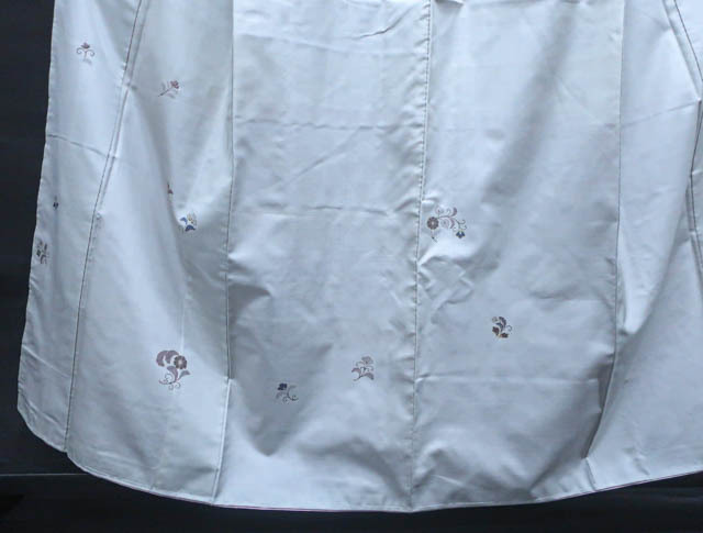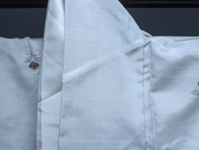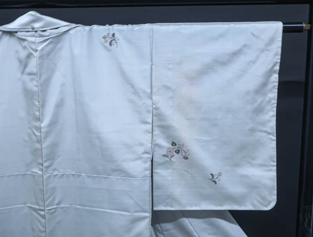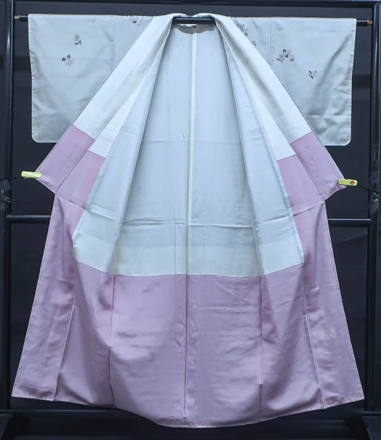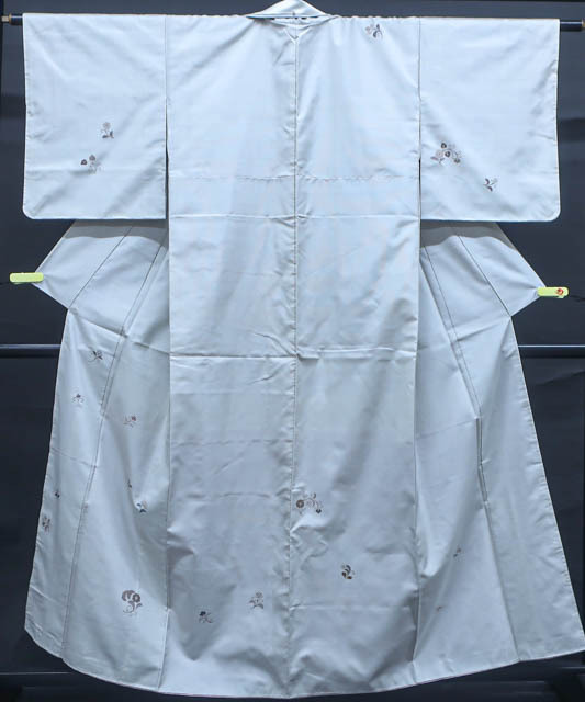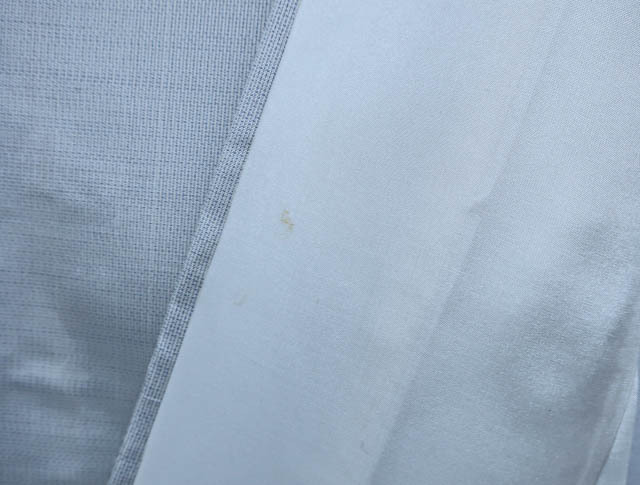 リサイクル商品のため、上前身頃、右後袖に小さな汚れがございます。 また、胴裏にスナップボタンによる汚れ、衿裏にシミがございますが着用可能なお品です。 地色は、ライトグレーです。 1枚目の画像が近いお色かと思われます。 素材は正絹です。 |