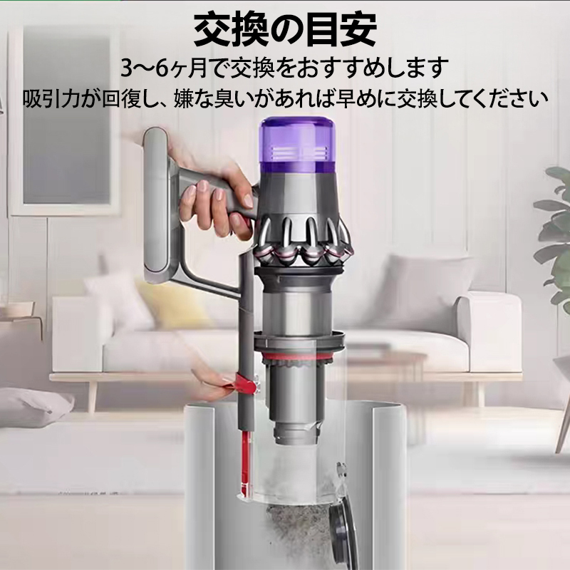 交換の目安 | フィルターは消耗品のため、ダイソン本来の性能を保つには、3~6ヶ月を目安に交換することをおすすめします。使用時間や使用環境によってフィルターの寿命は異なりますので、ご注意ください。 また、排気から生乾きのような臭いや異臭が感じられる場合は、雑菌が繁殖している可能性があります。その際は新しいフィルターへの交換を推奨いたします。 なお、本フィルターは水洗い・手洗いが可能ですので、定期的に洗浄することで、より清潔な状態を保てます。 |