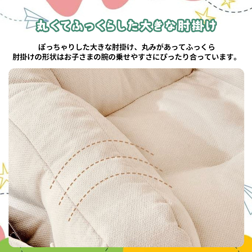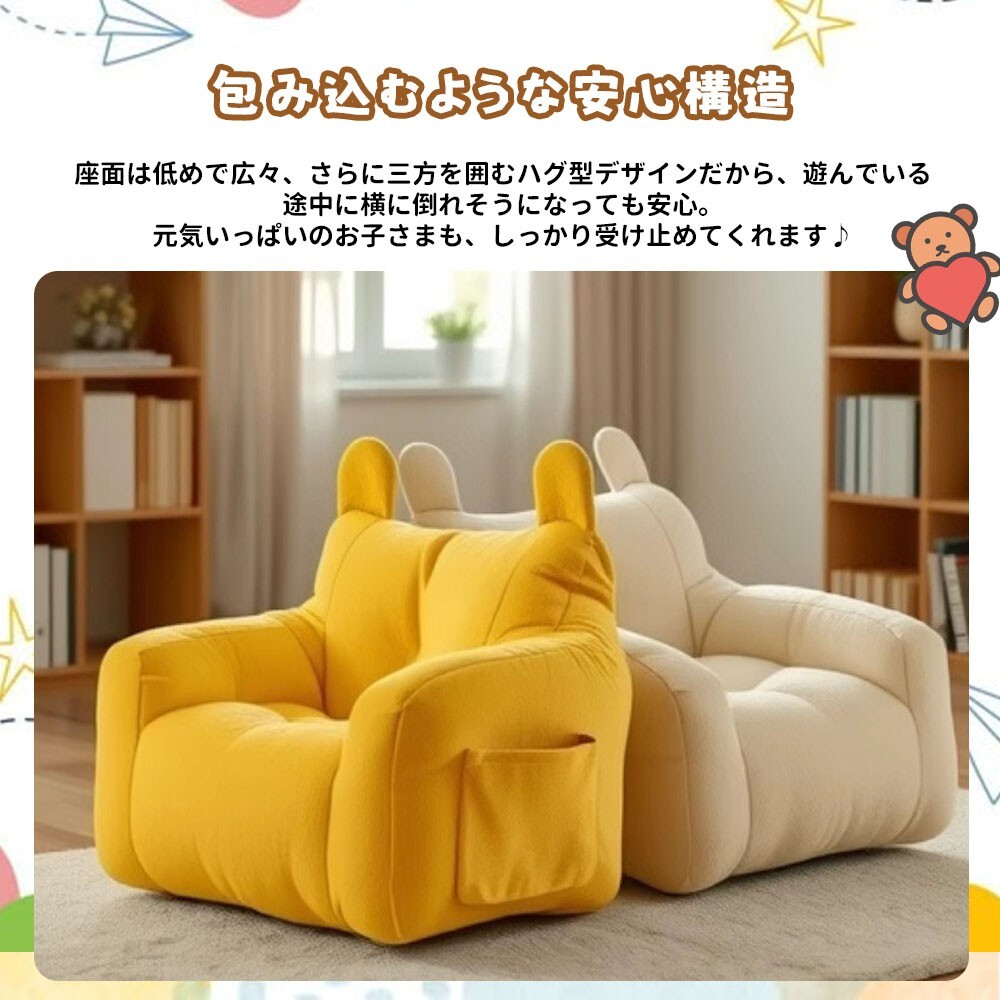 サイズ:38×38×35cm。小さめのデザインながら、大人も座れる安定感。お昼寝や読み聞かせの時間、一緒に遊ぶときにもぴったりです。