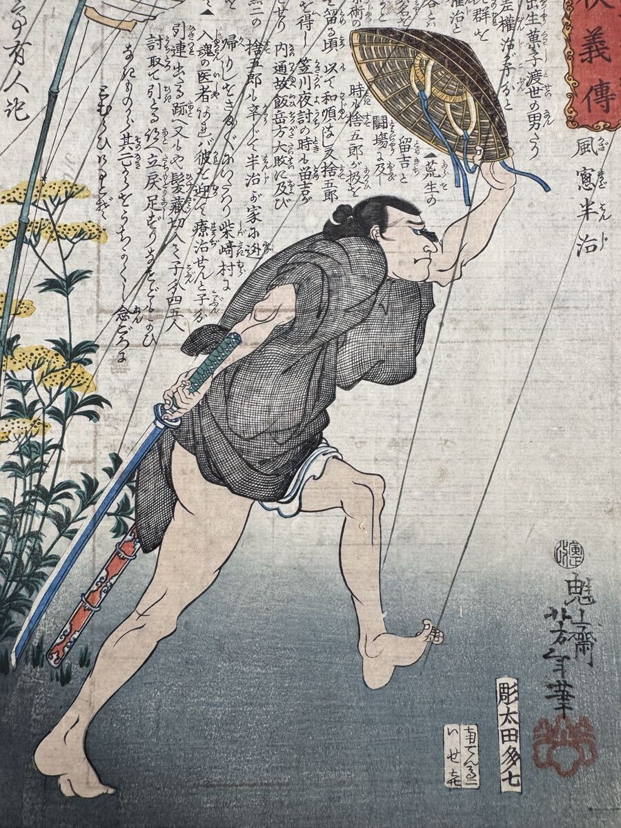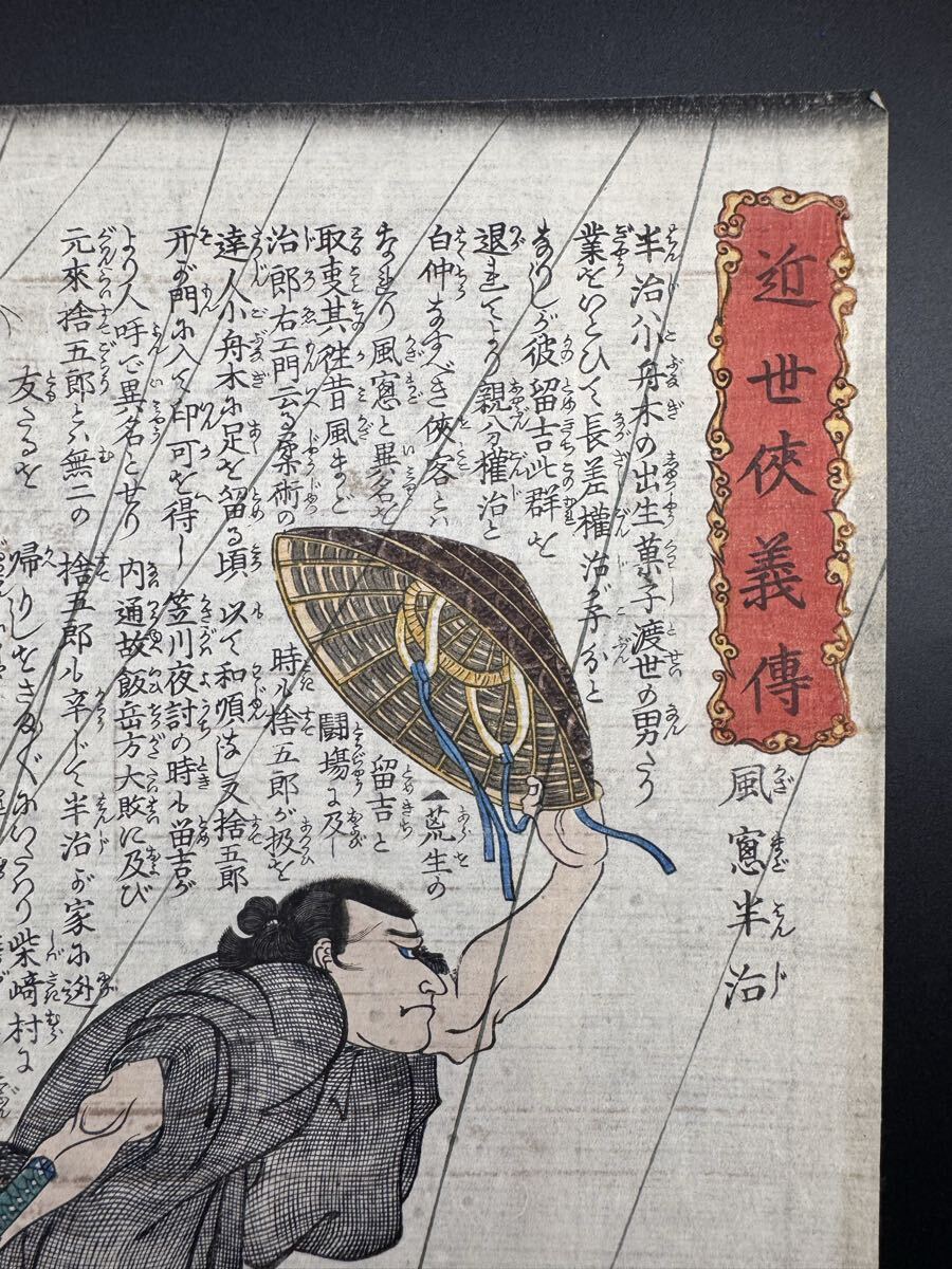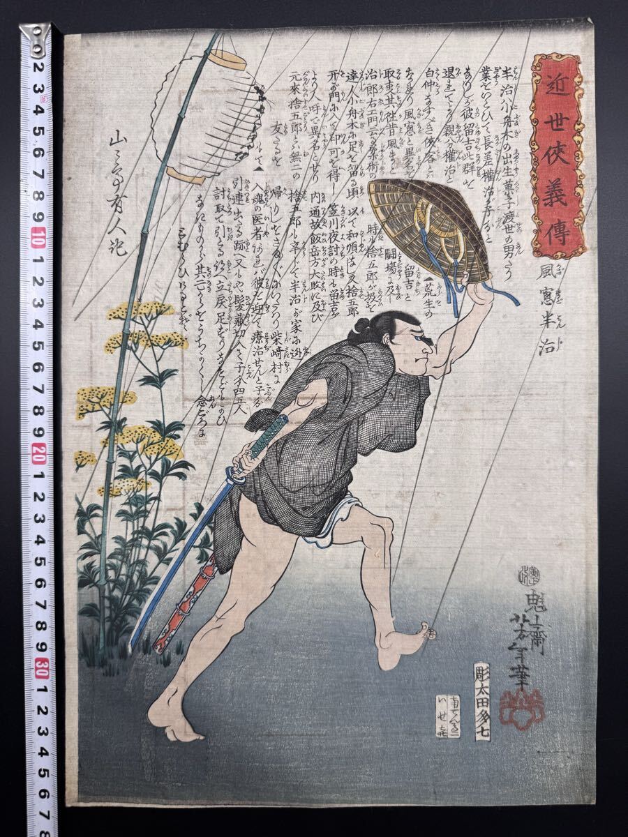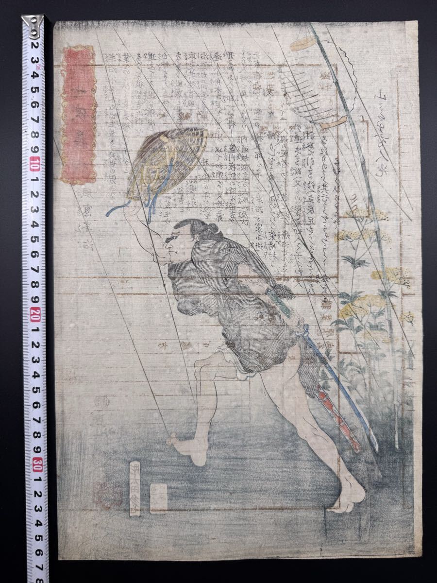 【真作】本物浮世絵木版画 月岡芳年「近世侠義伝 風窓半治」明治期 武者絵 錦絵 大判 保存良い