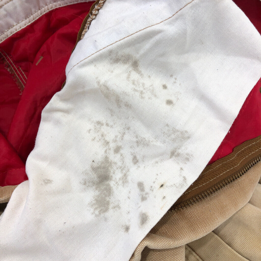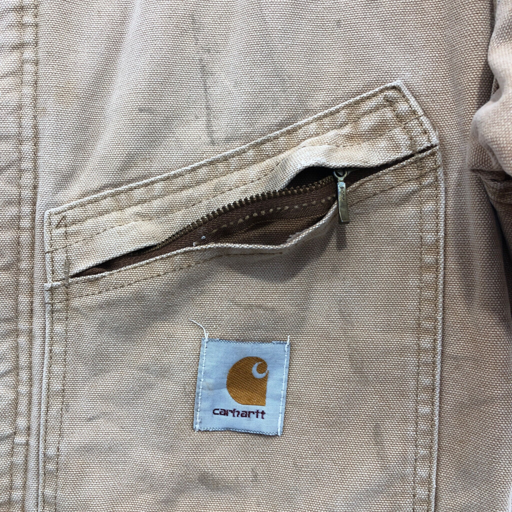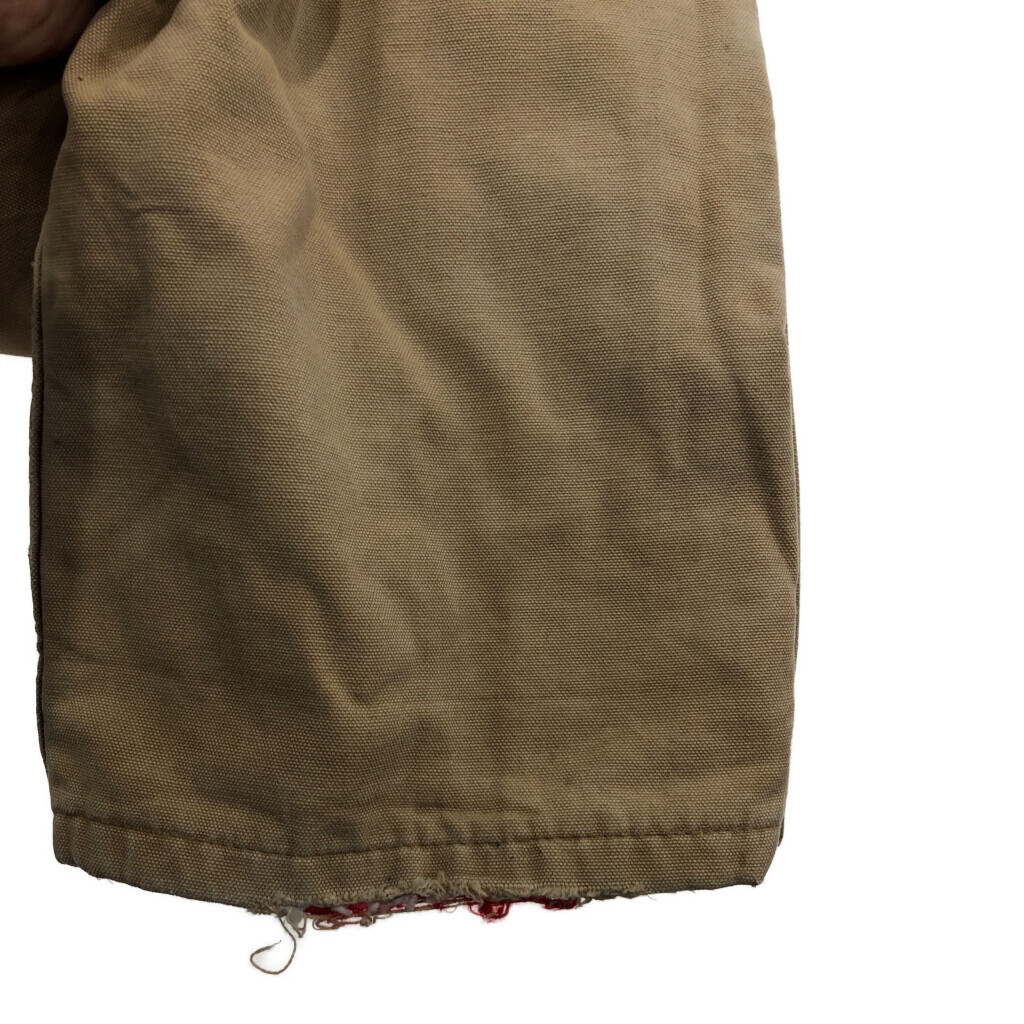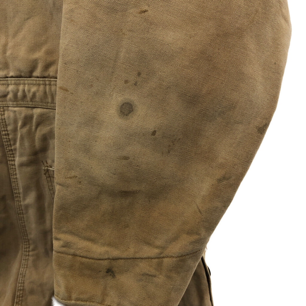 【商品管理番号】 P7453 【ブランド】 Carhartt/カーハート 【サイズ】 -- 表記無し(≒ L相当 ) 【実寸サイズ】 総丈:約156cm 肩幅:約49cm 身幅:約56cm ウエスト:約94cm 股上:約38cm 股下:約73cm わたり幅:約32cm 裾幅:約24cm 袖丈:約62cm 【主な素材】 表地 : コットン 【色】 ベージュ 【仕様】 90年代 ワーク ダック生地 裏地キルティング 【状態】 汚れ:袖、袖先、胸、背中、腰、裾、ヒップ、もも、スネ 破れ:裾 特記事項:色褪せ 胸ポケットジップ破損裾サイドスナップボタン欠損使用感有り |