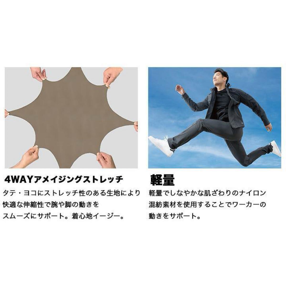 この素材は、縦横に伸縮するため、体の動きに柔軟に対応し、作業中の窮屈感を解消します。