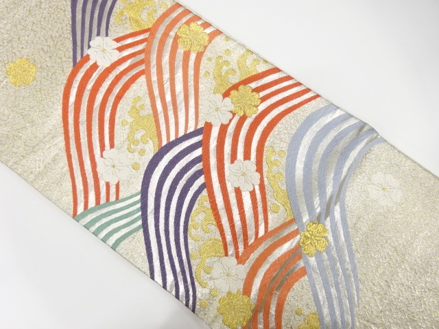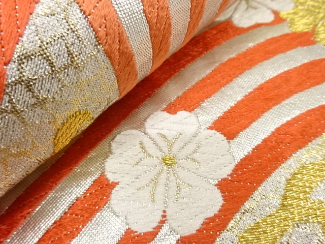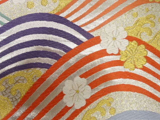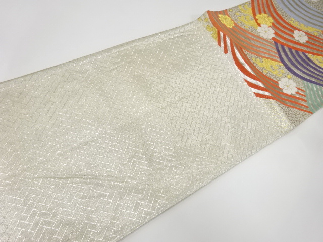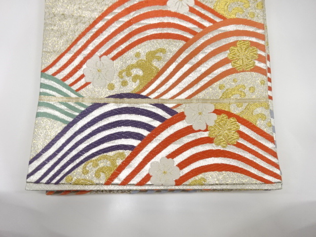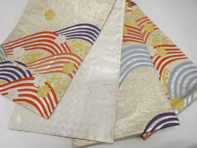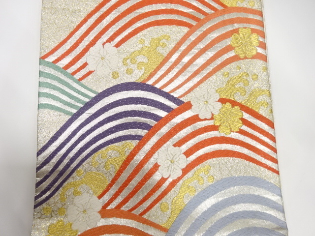 美品 佐賀錦 荒波に桜模様織り出し 振袖用 袋帯 (IH3K-062)
