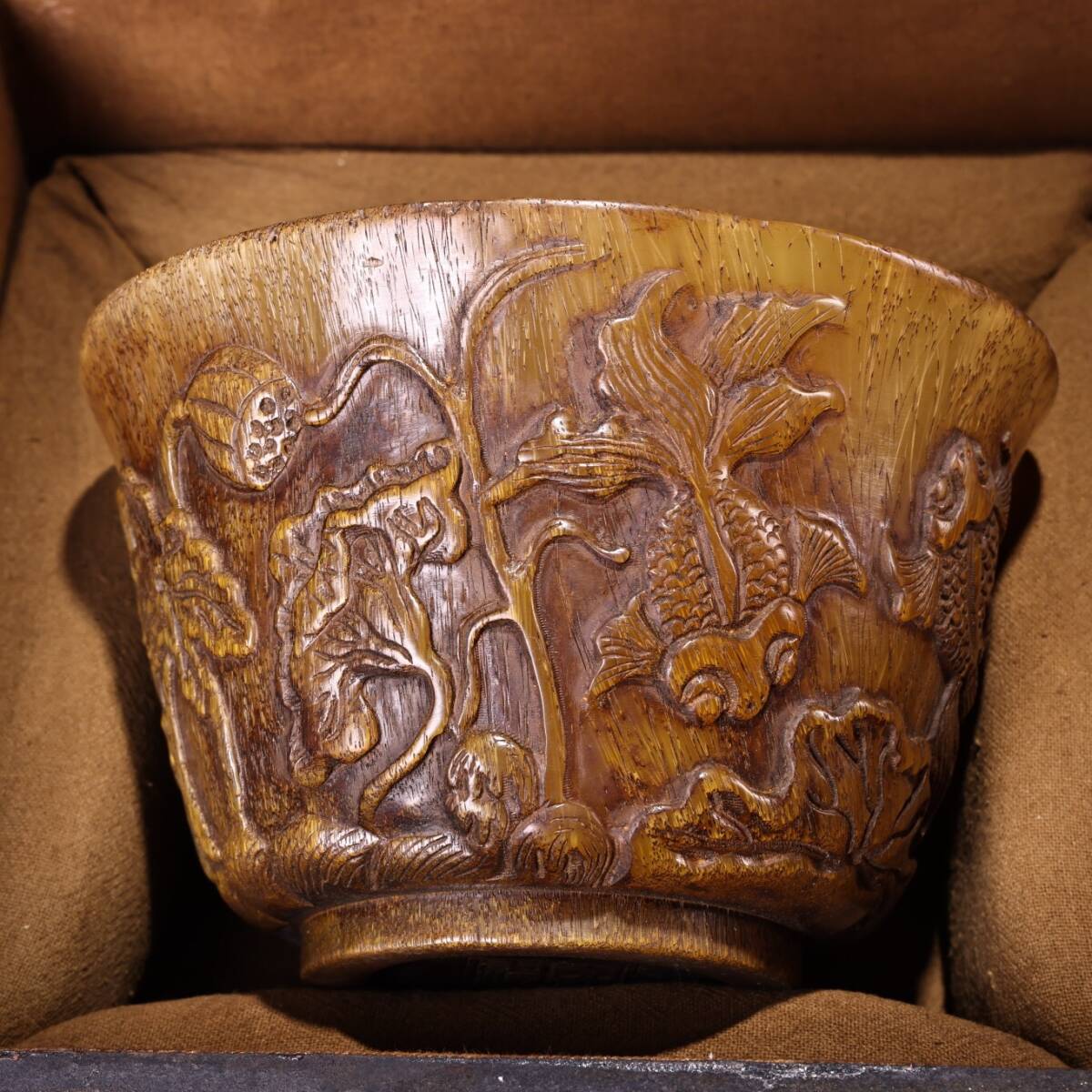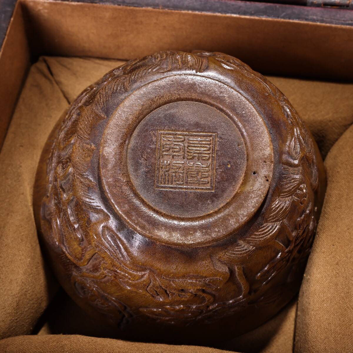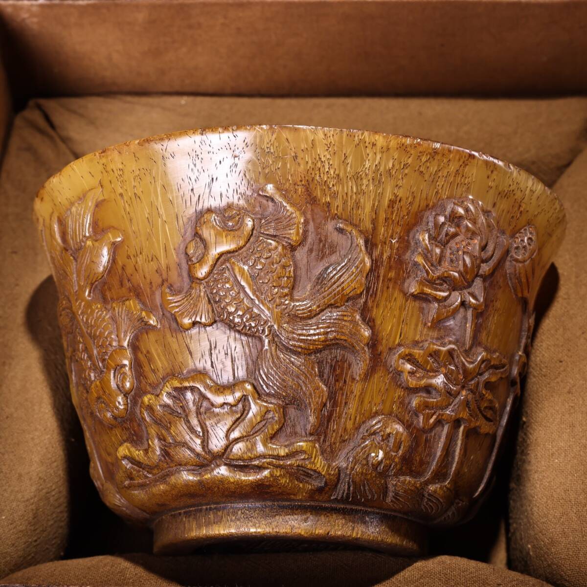 【超珍館蔵】角材細密彫 連年有餘紋 茶碗 箱付 置物 賞物 古賞物 古董品 古美術品 時代物 旧家蔵出 稀少珍蔵品