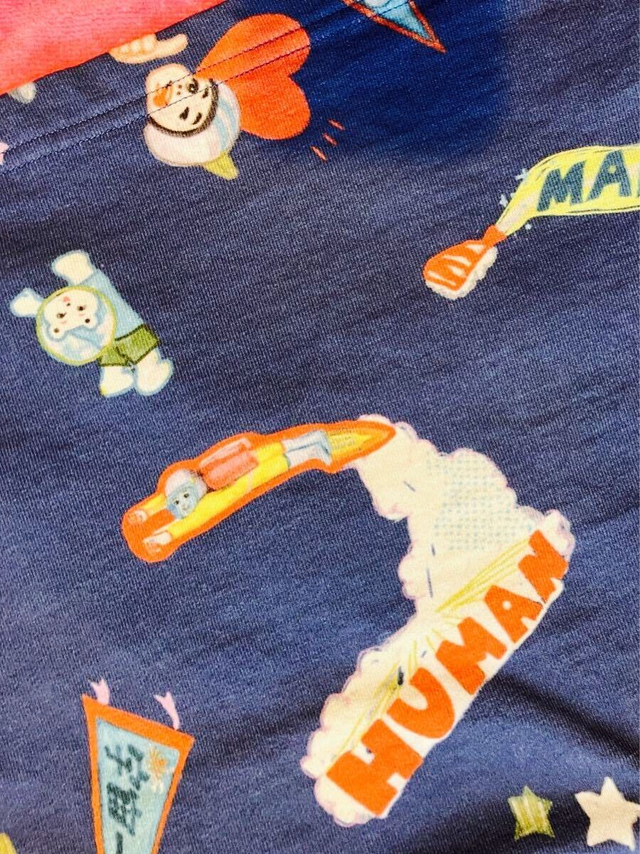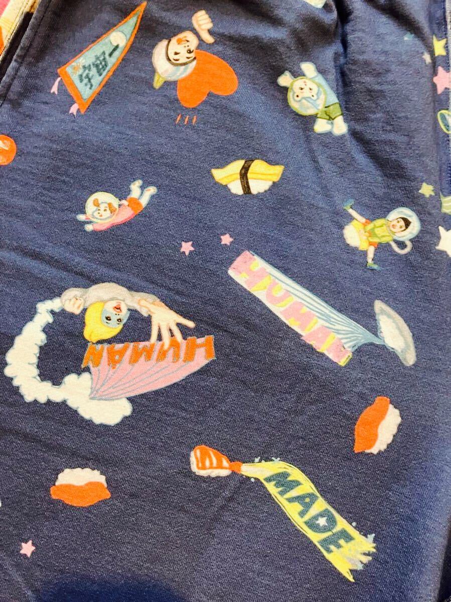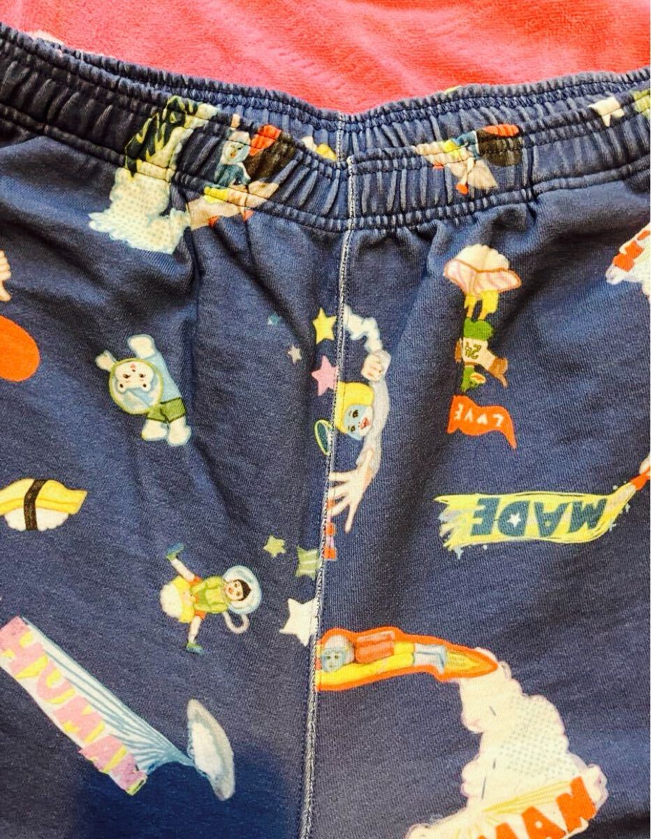 2025年8月2日に発売され直ぐにsold outになったスペーシーなイラストが可愛い総柄のスウェットショーツです。ウエストはゴムでドローコードが付いています。宇宙に浮かぶお寿司、ロケットボーイ、宇宙乙女などなど可愛くてワクワクします。