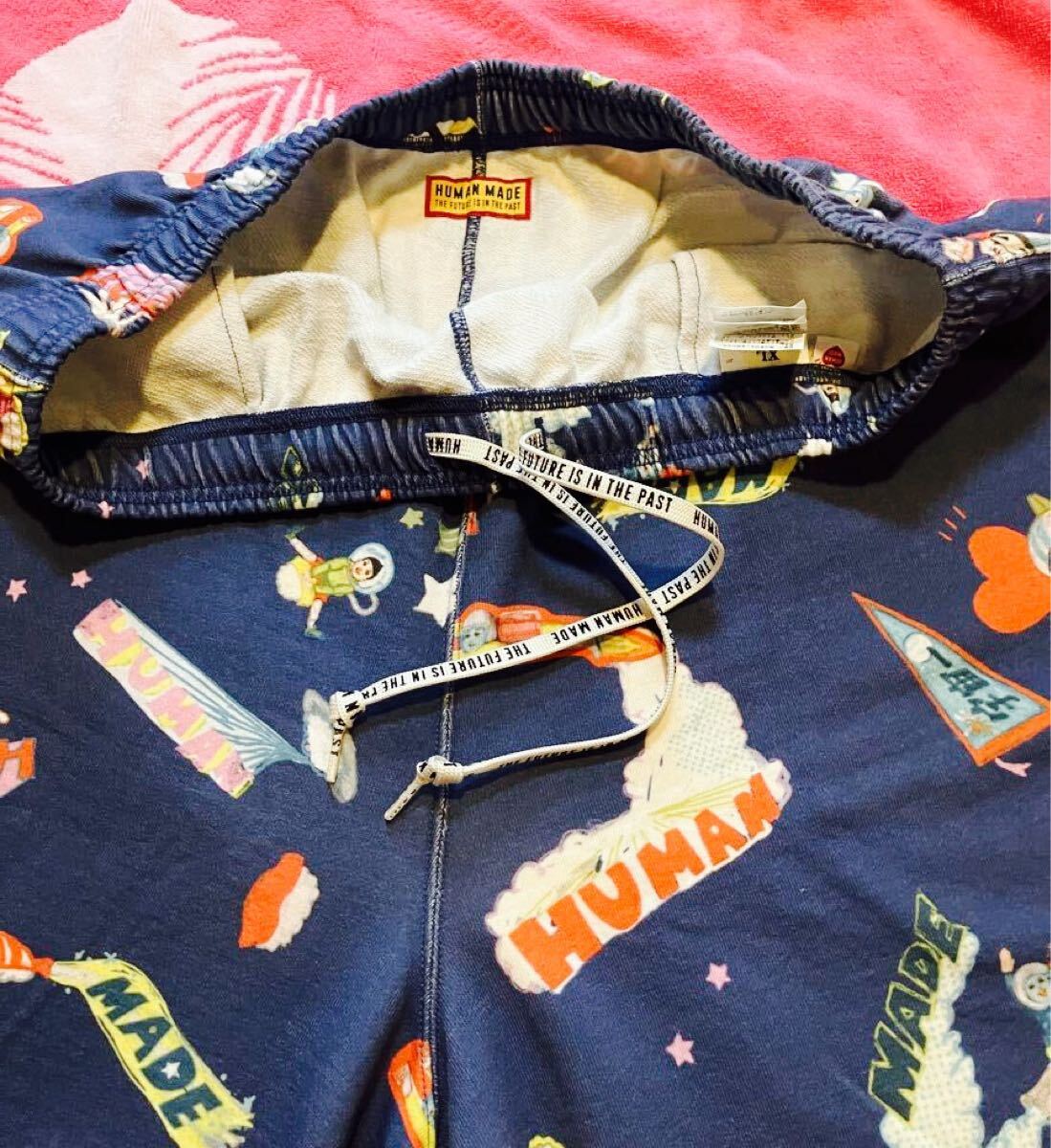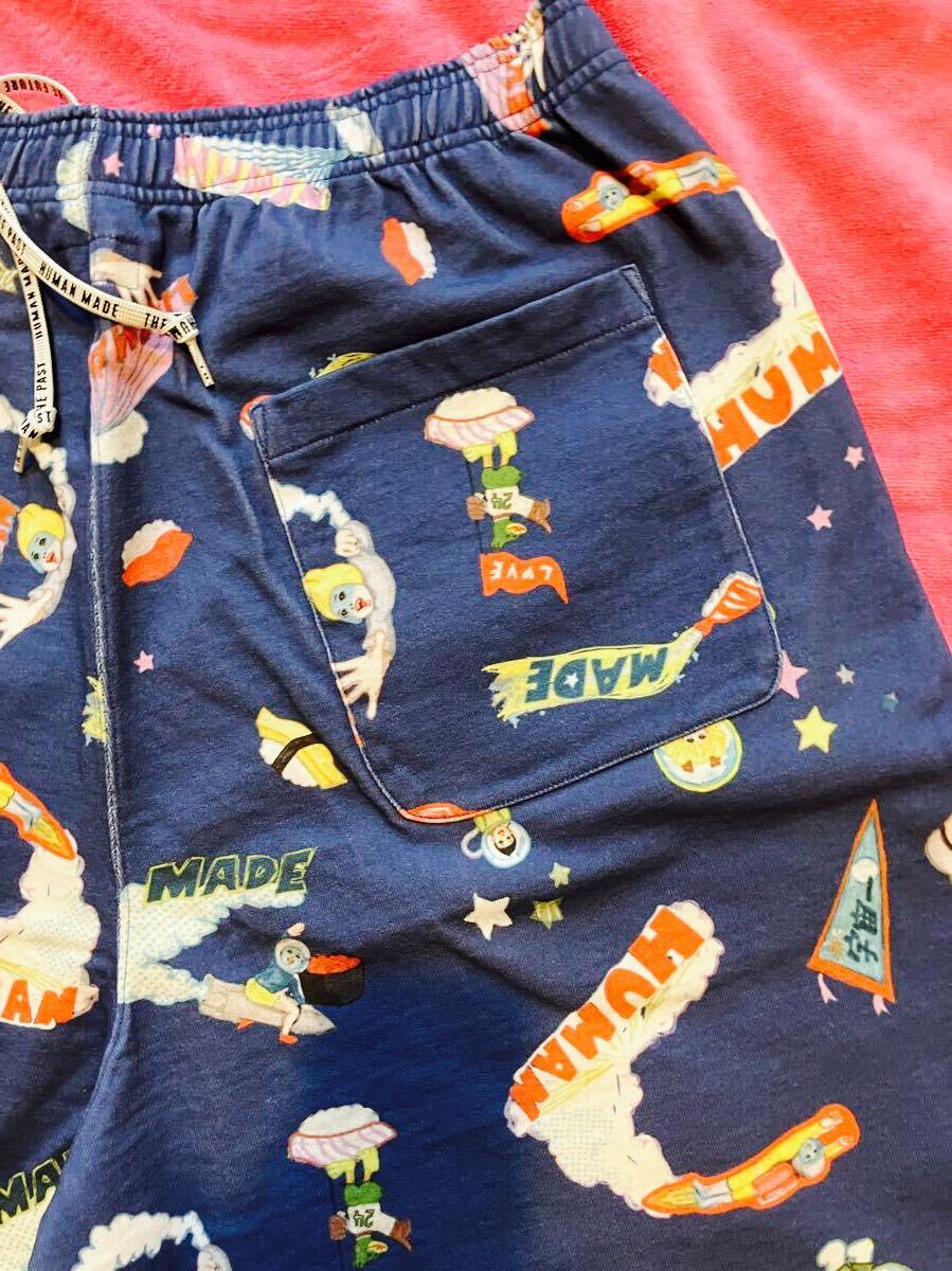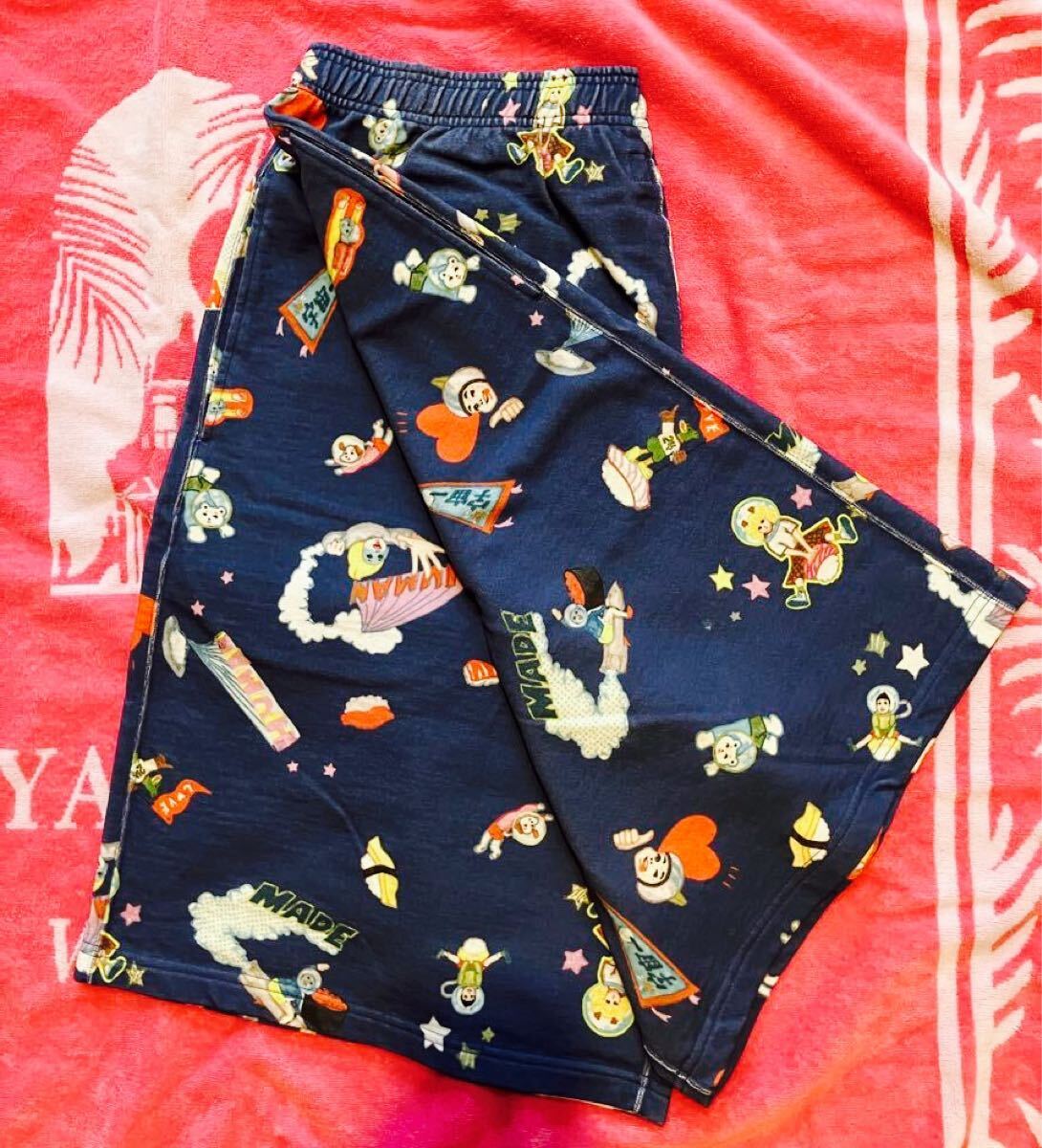 2025年8月2日に発売され直ぐにsold outになったスペーシーなイラストが可愛い総柄のスウェットショーツです。ウエストはゴムでドローコードが付いています。宇宙に浮かぶお寿司、ロケットボーイ、宇宙乙女などなど可愛くてワクワクします。