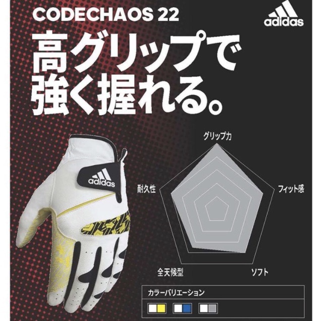 最大の特徴である平側のカオスグリップがさらに進化。クラブを握る際に重要となる中指から小指にかけてプリントを多く配置することでグリップ力を強化。また、摩耗しやすい小指の下側と親指の腹部分を強化することで耐久性をアップ。人差し指から小指にかけて立体裁断を採用し、平部分にできるシワを軽減し優れたフィット感を実現している。