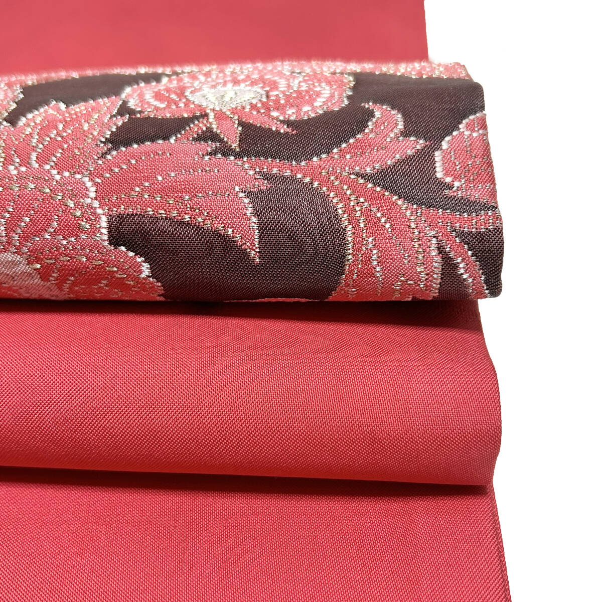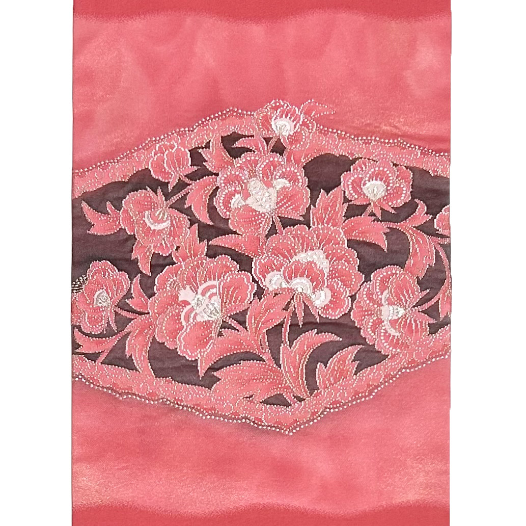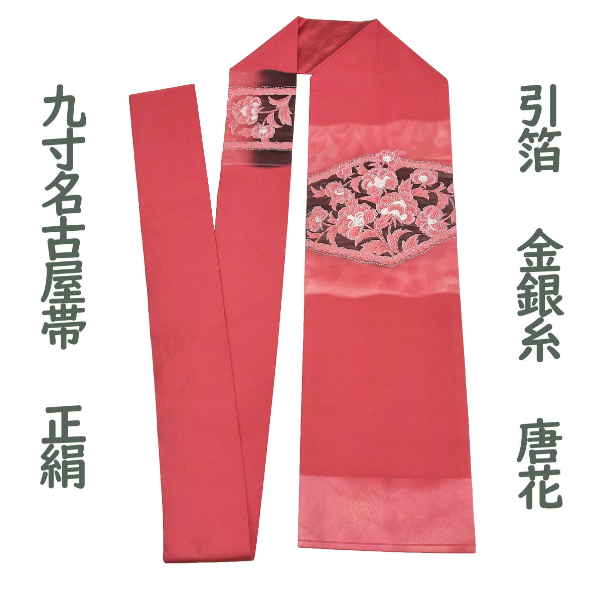 ベリーレッドの地に、お太鼓部分には引箔が用いられ、綺麗で可愛い唐花が金銀糸を用いながら織り出された、大変素晴らしい九寸名古屋帯です。どうぞこの機会に是非ご検討下さい!