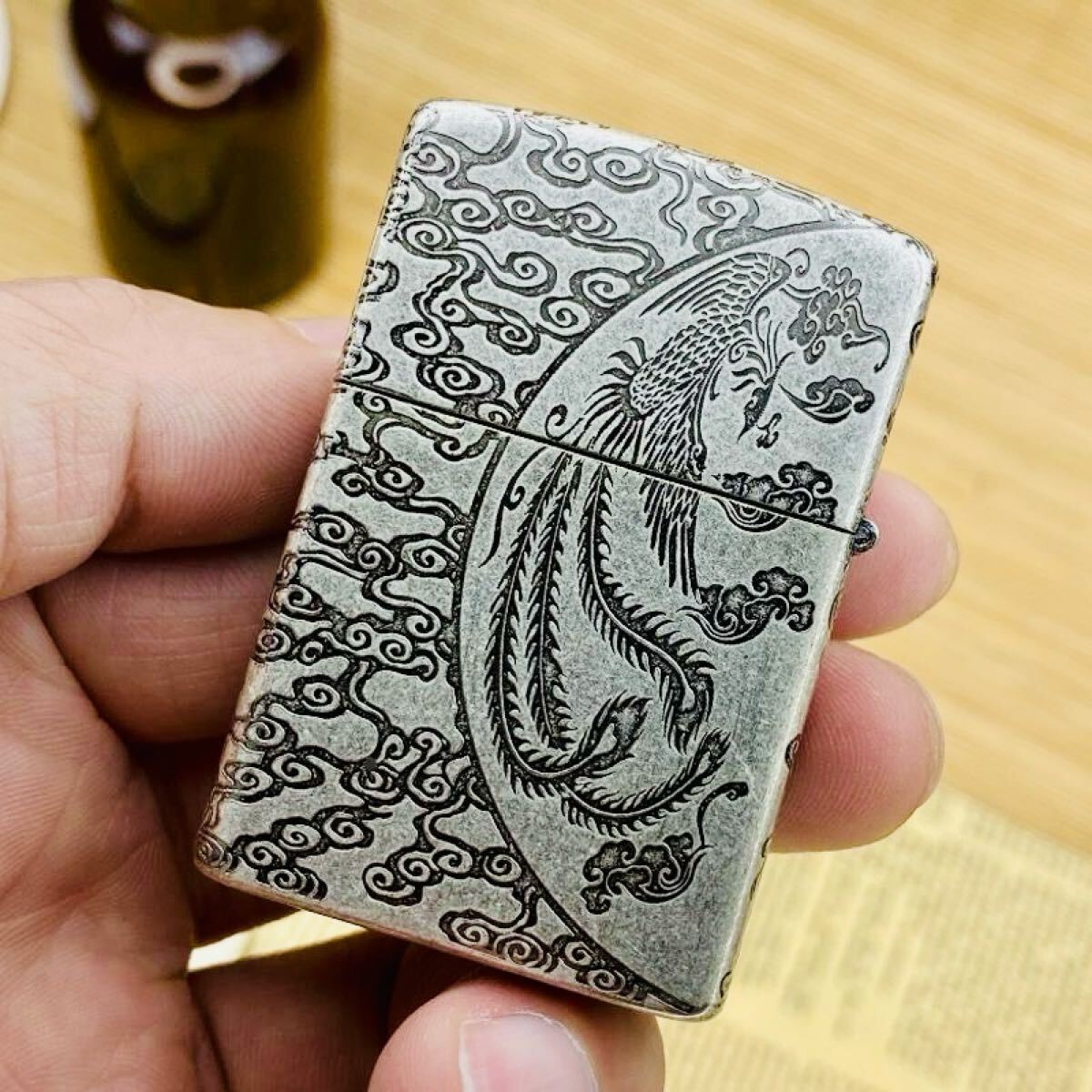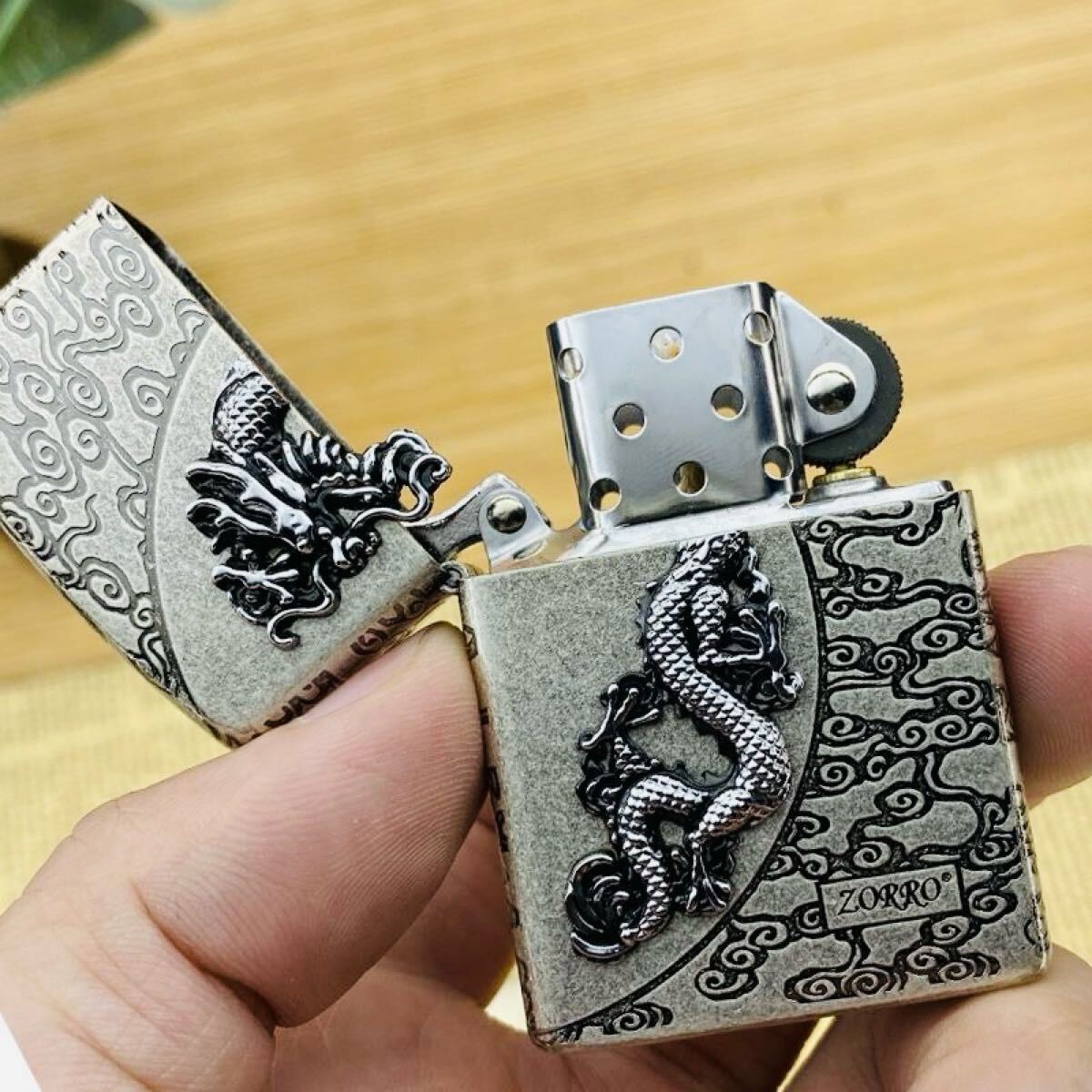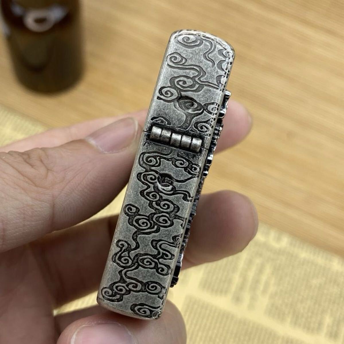精巧な立体龍デザイン: 材質は 銅を素材として使用しており、表面には力強く威厳のある龍がレリーフで表現され、細部まで緻密に彫られた鱗が力と権威を象徴しています。裏面には優雅な鳳凰がデザインされ、吉祥や再生を象徴しています。龍と鳳凰の組み合わせは、調和と幸運を表す「龍鳳呈祥」を象徴しています。全体的に、雲紋がライターを取り囲み、クラシックで神秘的な魅力を一層引き立てています。