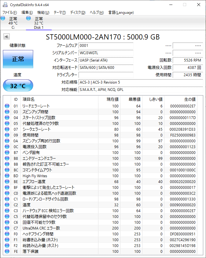 Seagate ST5000LM000 5TB 15mm 2.5インチ SATA 使用時間:2435時間 動作品 WCJ3WGTL です。