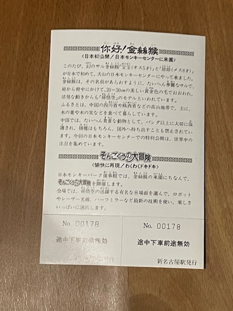 名古屋鉄道 そんごくうの大冒険 日本モンキーパーク 記念乗車券 レンチキュラー印刷 (管理番号33-25)