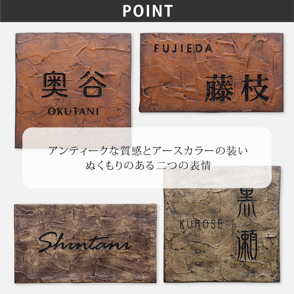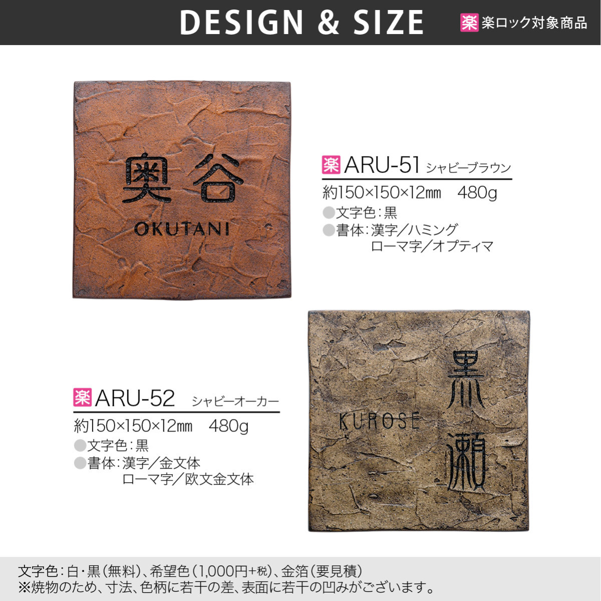 取付方法 | 引っ掛け穴タイプ:ネジと接着剤でのお取り付け。 ボルトタイプ:表札裏ボルトと接着剤でのお取り付け。 楽ロック:ボルトと楽ロック専用金具でのお取り付け。 |