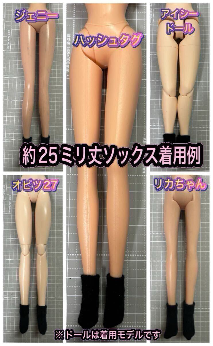 リカちゃん、ジェニー、ネオブライス、アイシードール 、オビツ27女性ボディ、ハッシュタグボディなどが着用出来る、薄手の化繊ソックス長さ違い、平置きで約125ミリ、85ミリ、65ミリ、45ミリ、25ミリの5足セットです。