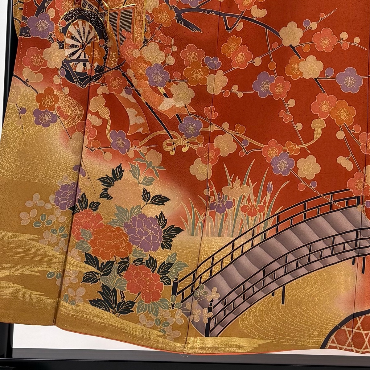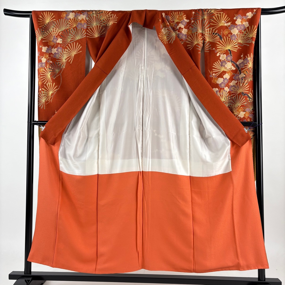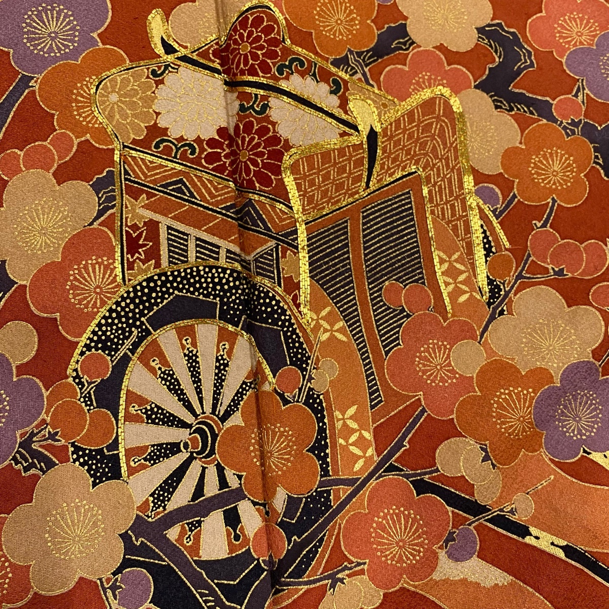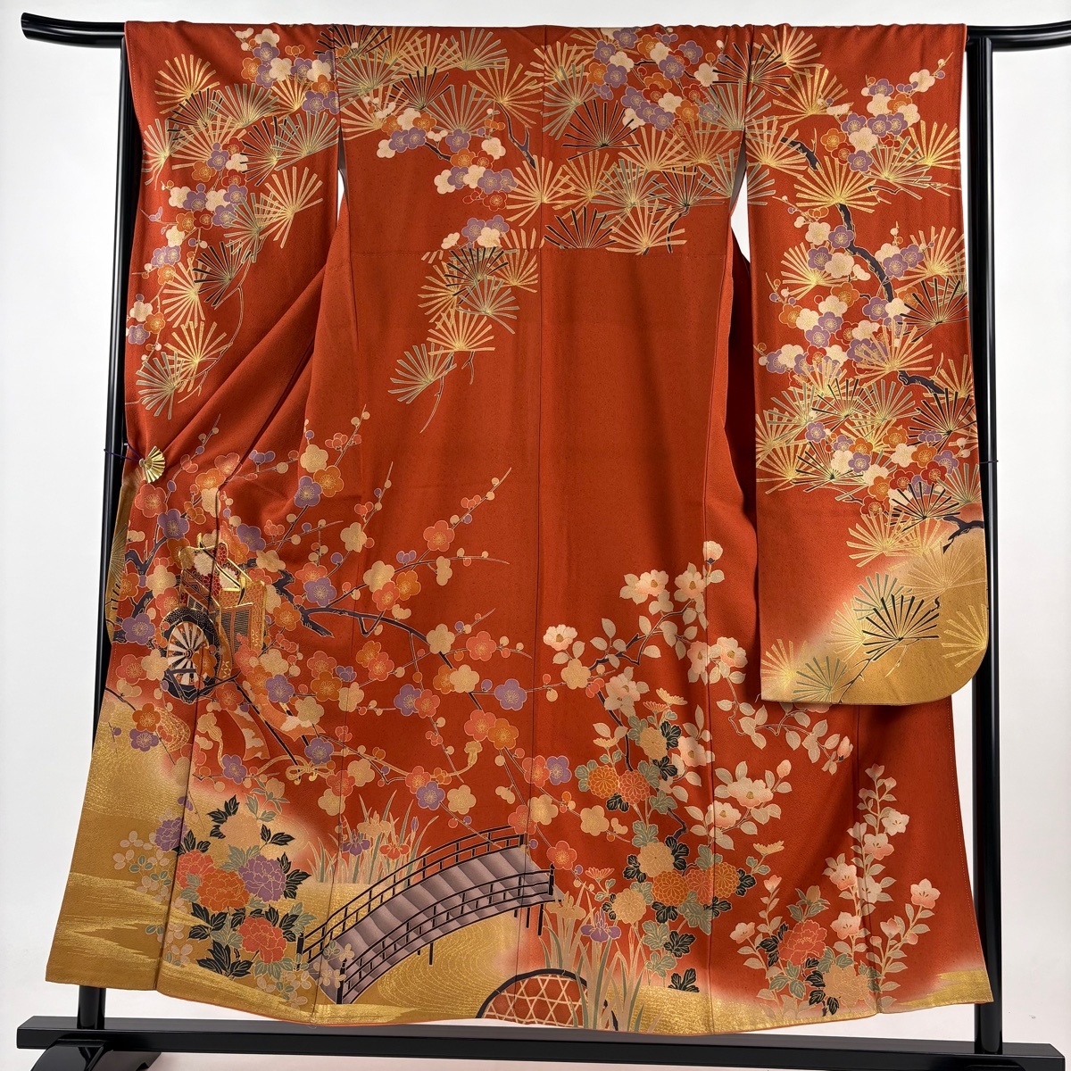 | 振袖 秀品 御所車 枝梅 金糸 金彩 赤茶 袷 身丈154 裄丈64.5 M 正絹 【中古】 |