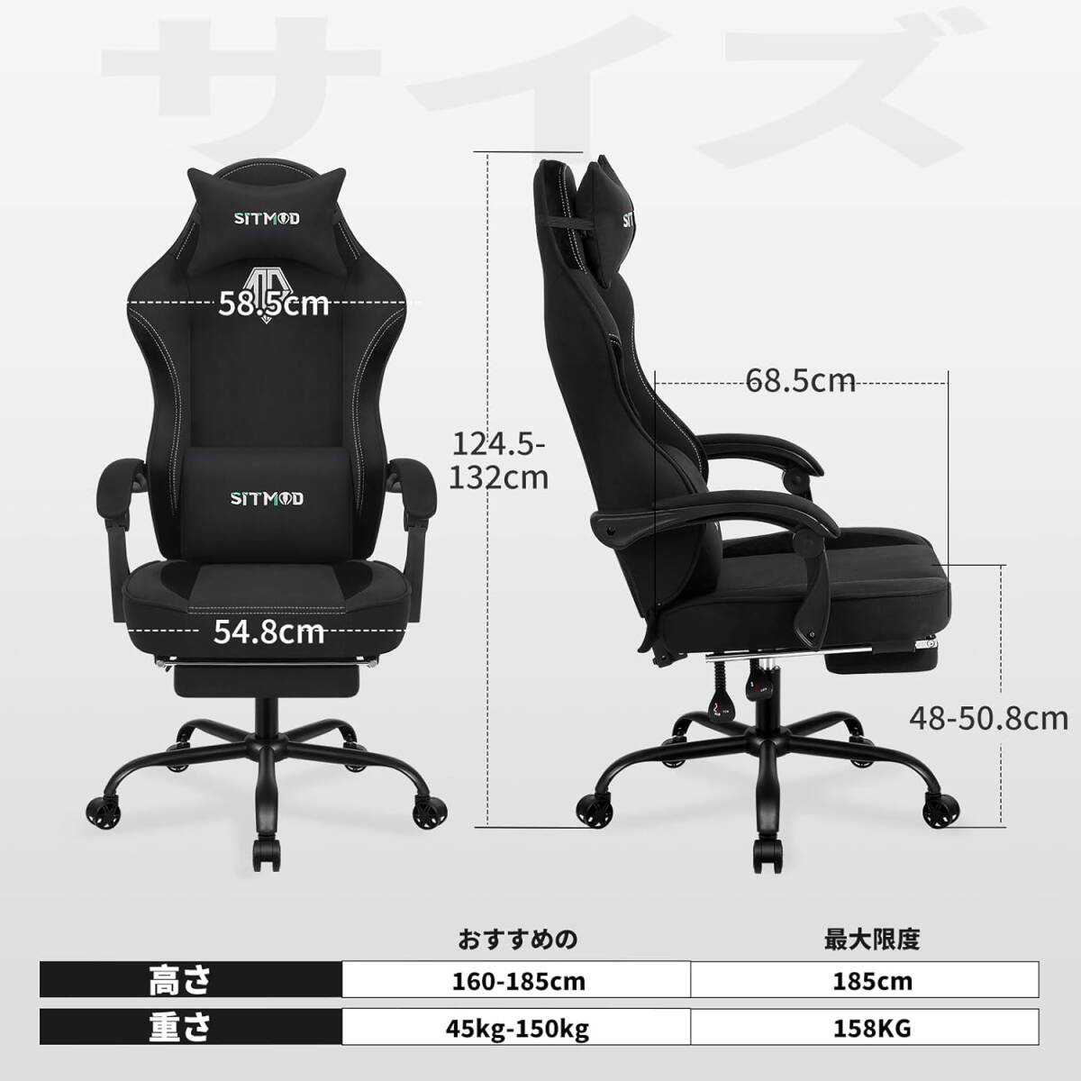 ゲーミングチェア フットレスト付きPCチェア 通気性ファブリック 360度回転椅子 レーシングスタイル リクライニング 人間工学 ブラック