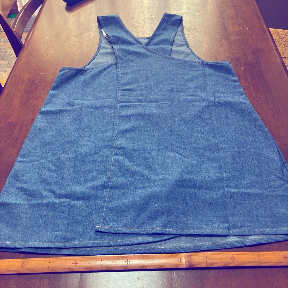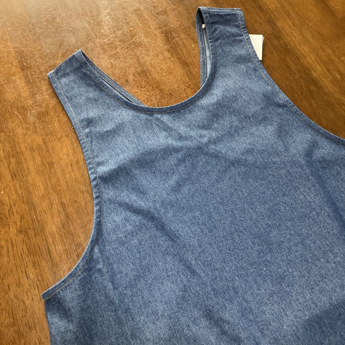 ストレッチ素材のデニムのエプロンです。後ろボタンなしのフリークロスのオシャレなエプロンです。