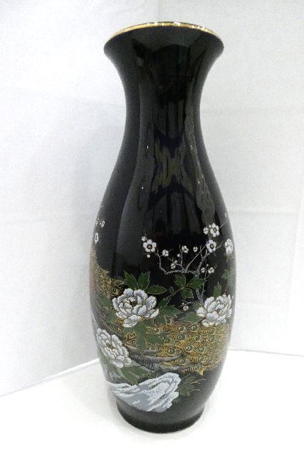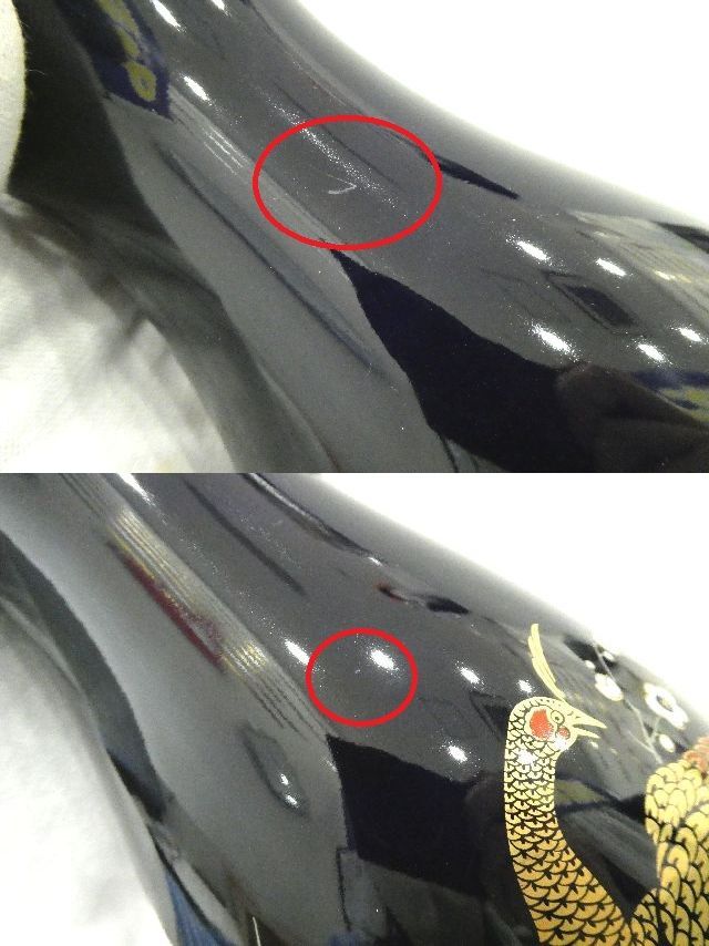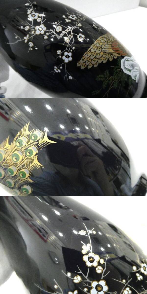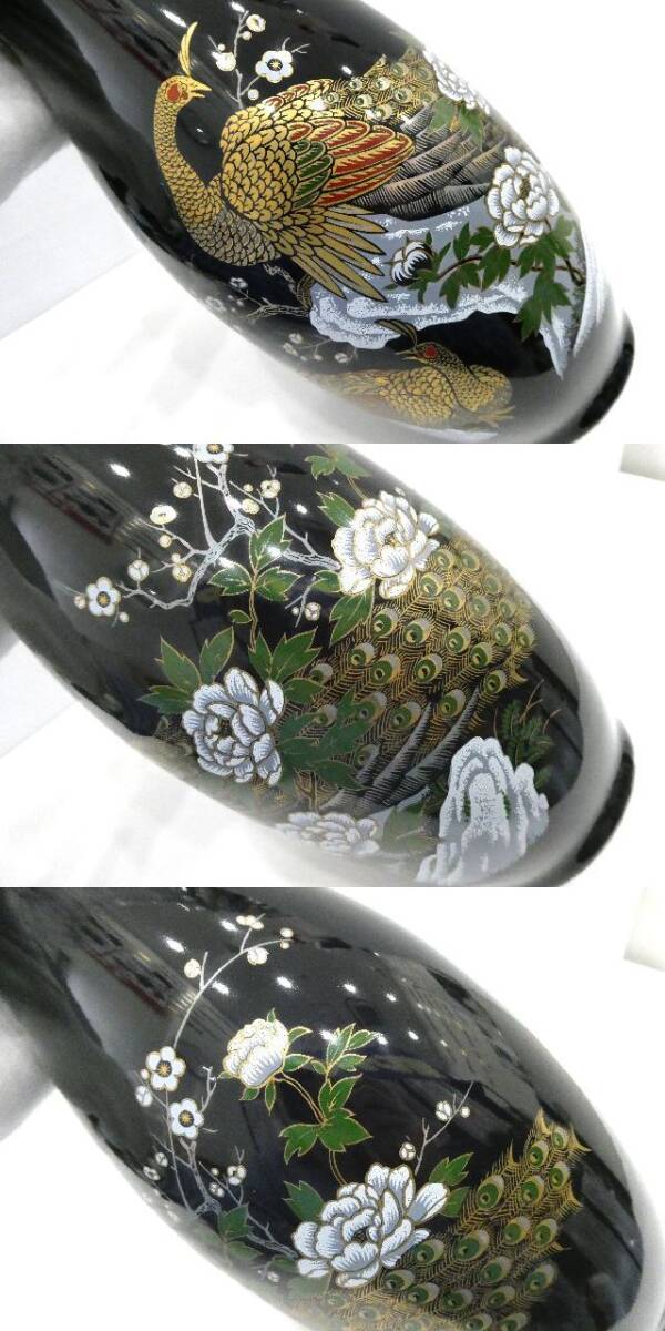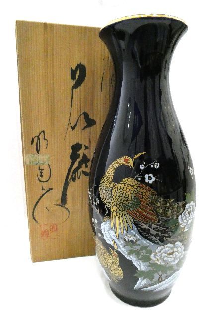 九谷焼 明陶 孔雀 牡丹 花瓶 フラワーベース 飾り壺 インテリア 置物 中古 木箱入り | |||