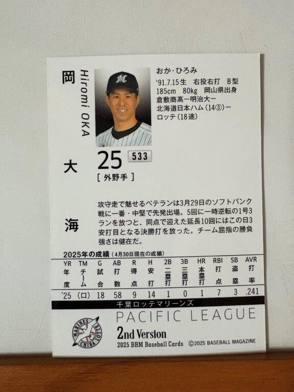 【2025 BBM 2nd】533岡大海(千葉ロッテマリーンズ)レギュラーカード